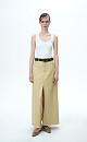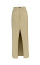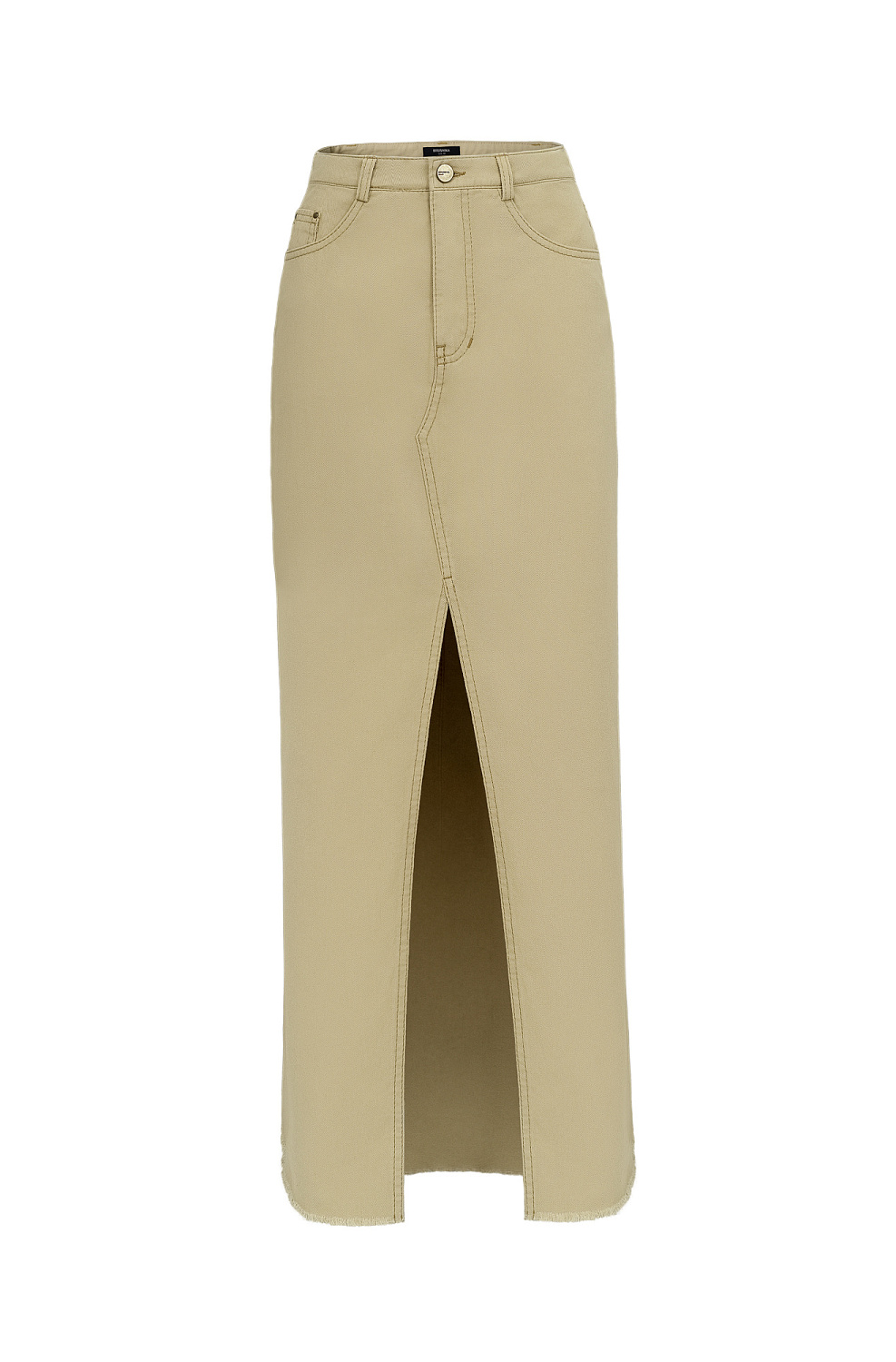 100% cotton denim skirt with a front slit and raw hem. Mid-rise maxi skirt with zipper and button closure.