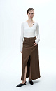 100% cotton denim skirt with a front slit and raw hem. Mid-rise maxi skirt with zipper and button closure.