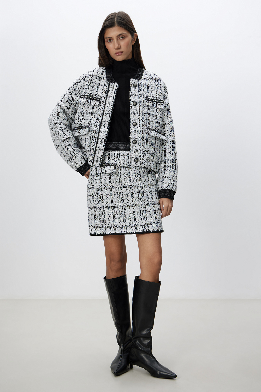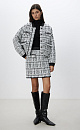 Mini length knitted skirt. The model is made of textured tweed with imitation patch pockets and a zipper closure. The product is decorated with lurex, sequins and beads. Elastic waistband