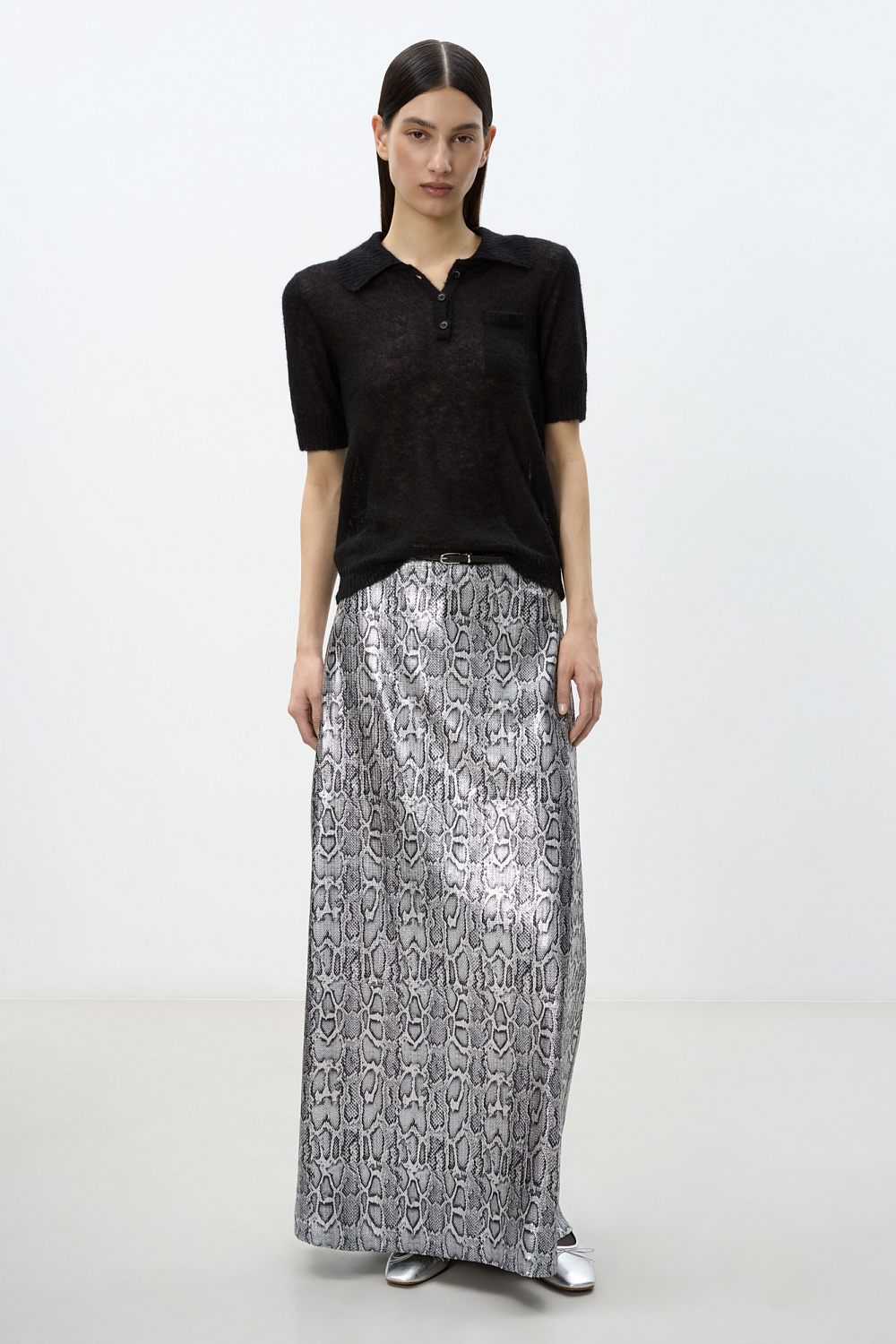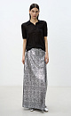 Maxi-length skirt in a textured fabric with an animal print that imitates snake scales. The product is decorated with small sequins. Straight silhouette model. Zip closure. Lined.