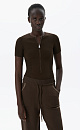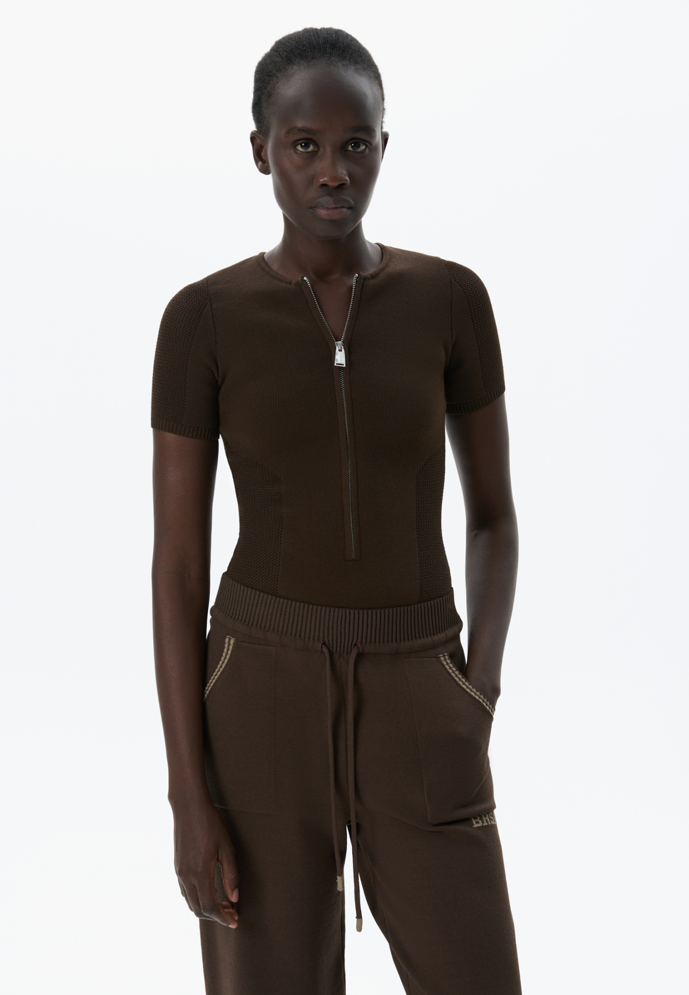 Knit bodysuit with short sleeves. Front zip and round cut on the back.