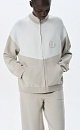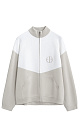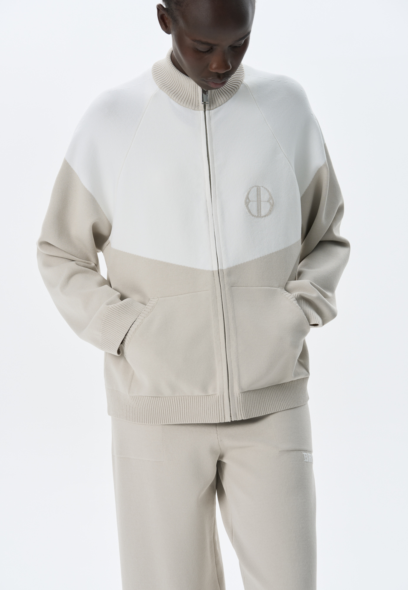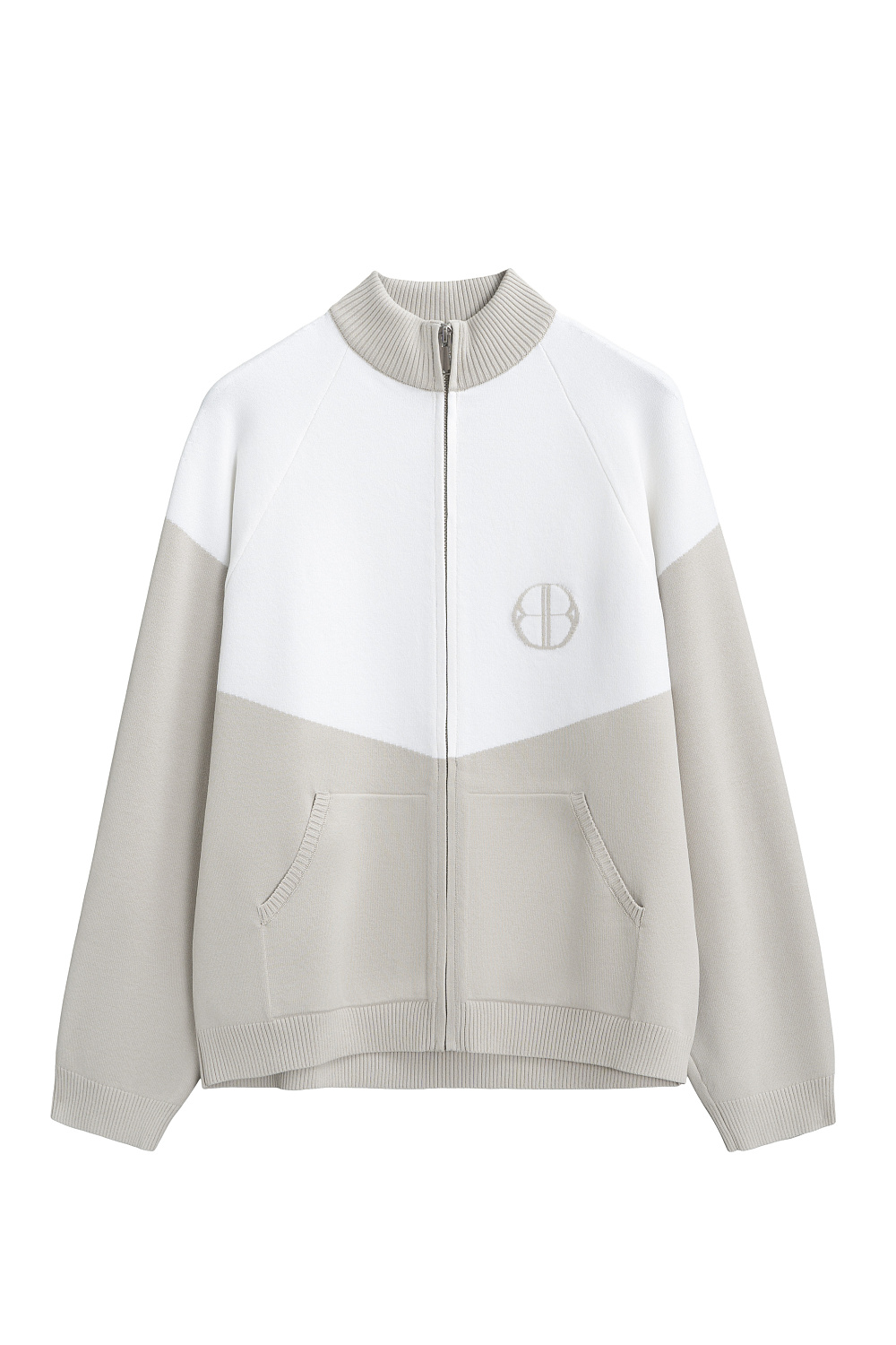 Knitted bomber jacket made of viscose with added elastane. The model has a straight silhouette, with raglan sleeves, a low stand-up collar and side pockets. The product is decorated with branded jacquard on the chest. Zip closure.