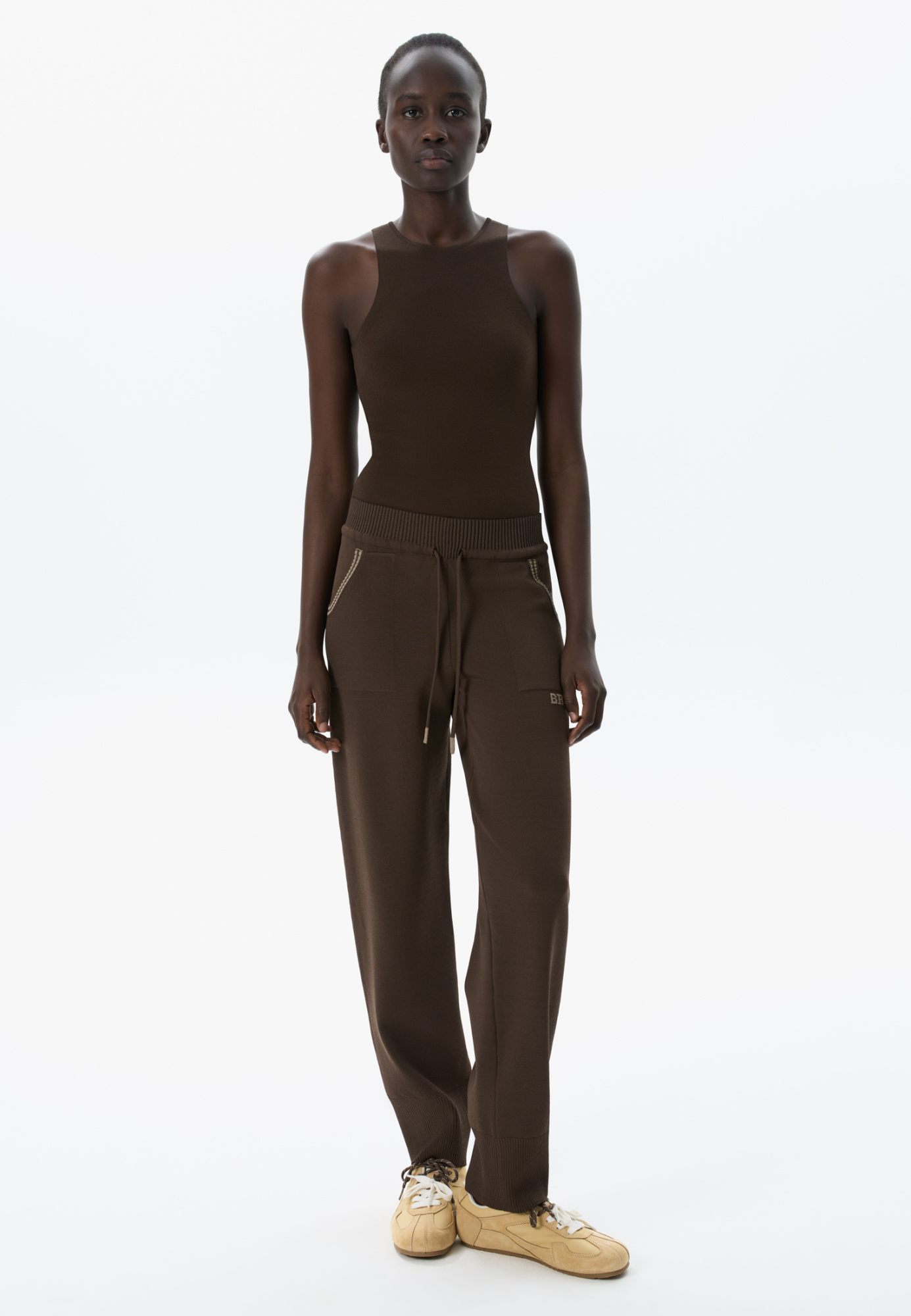 Knitted trousers made of viscose with the addition of elastane. The model is made in a sporty style, with a wide elastic waistband with a drawstring, side pockets and wide cuffs with elastic.