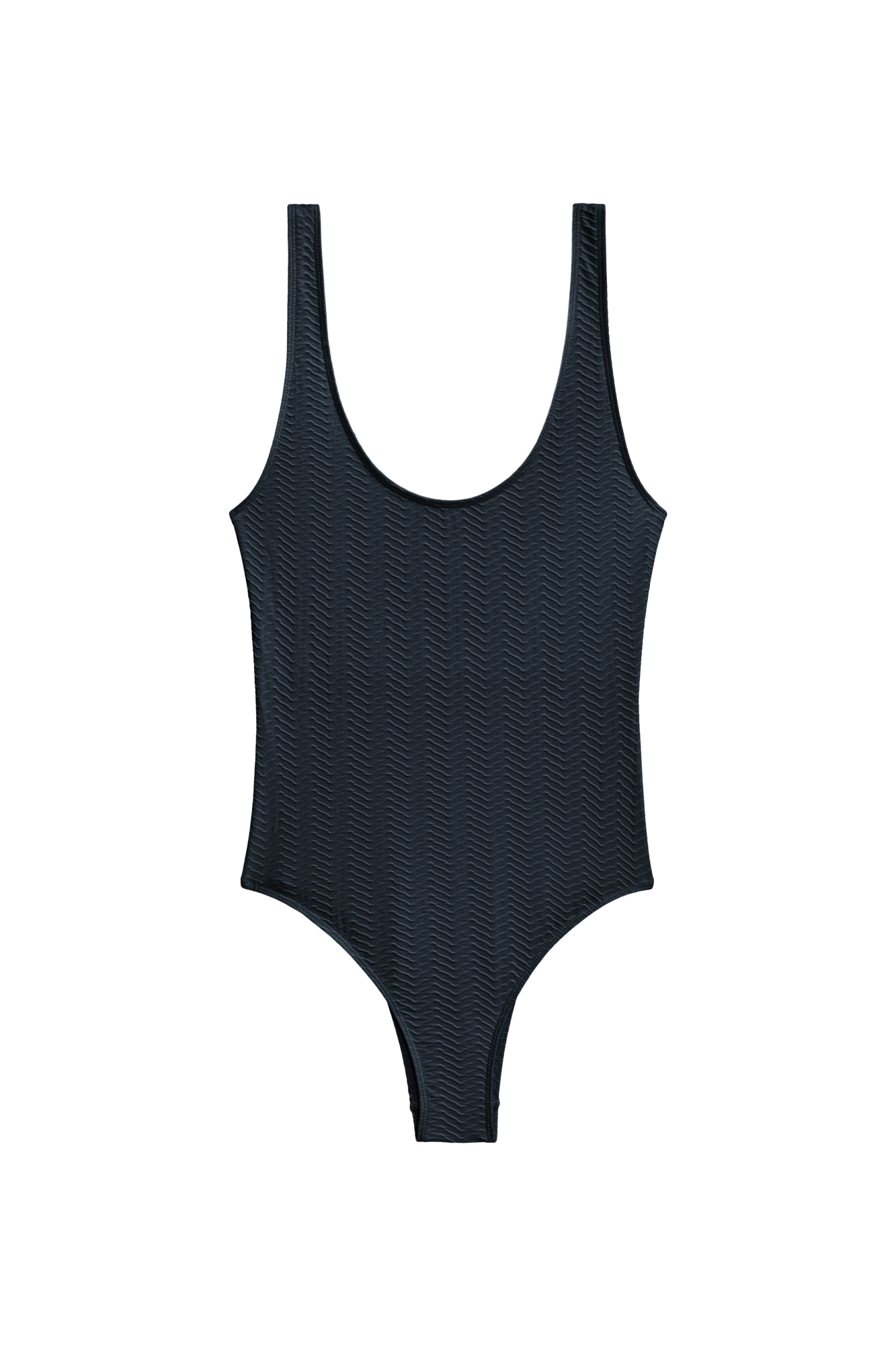 Classic one-piece swimsuit with thin straps, U-neck and plunging back.