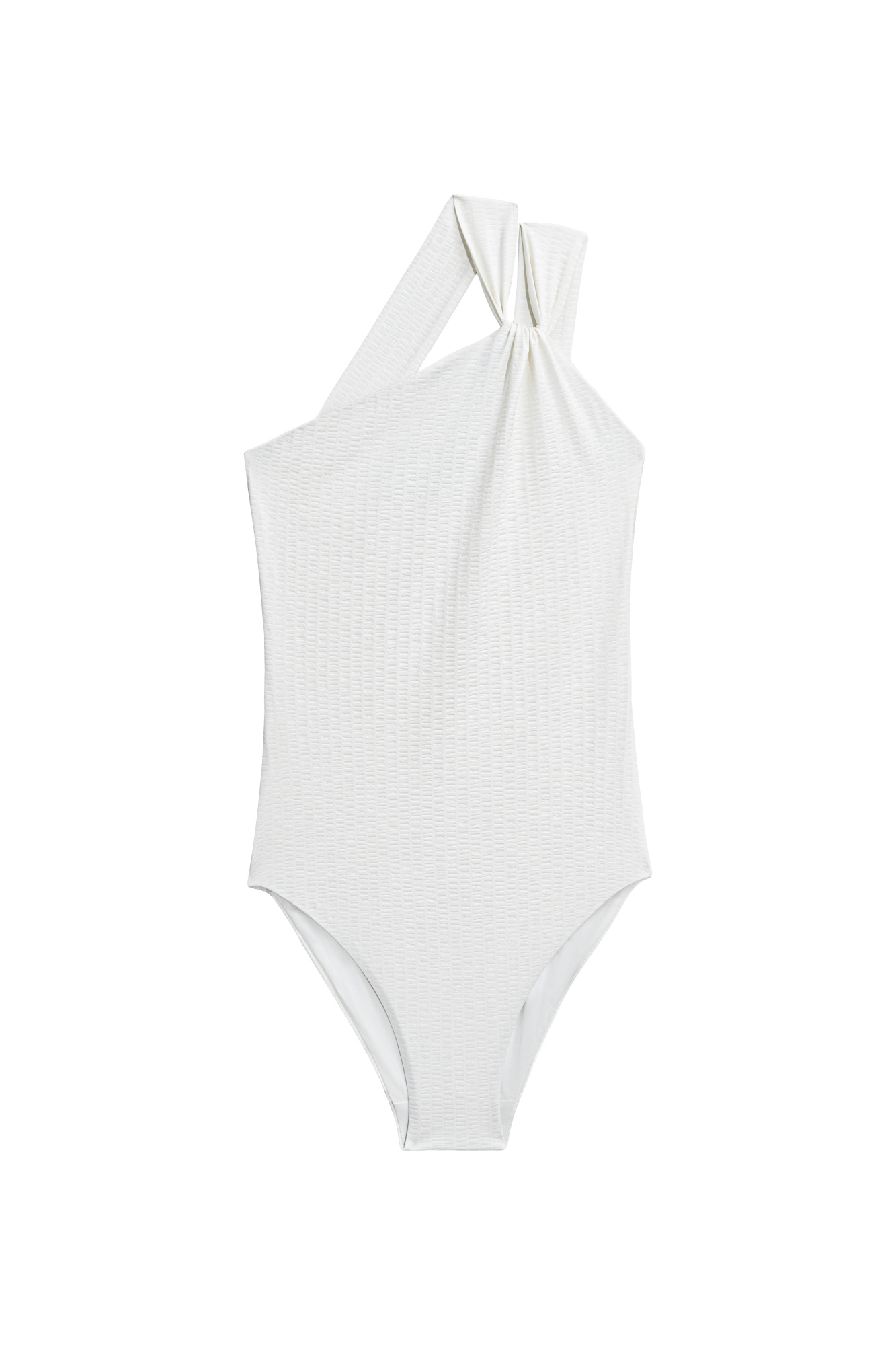One-piece swimsuit with asymmetrical top. The model is made of textured material.