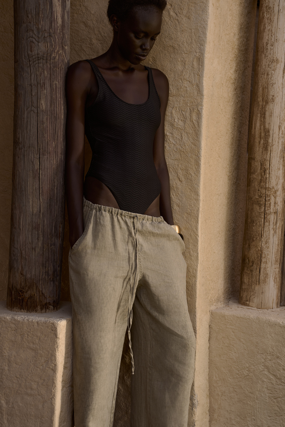 Classic one-piece swimsuit with thin straps, U-neck and plunging back.