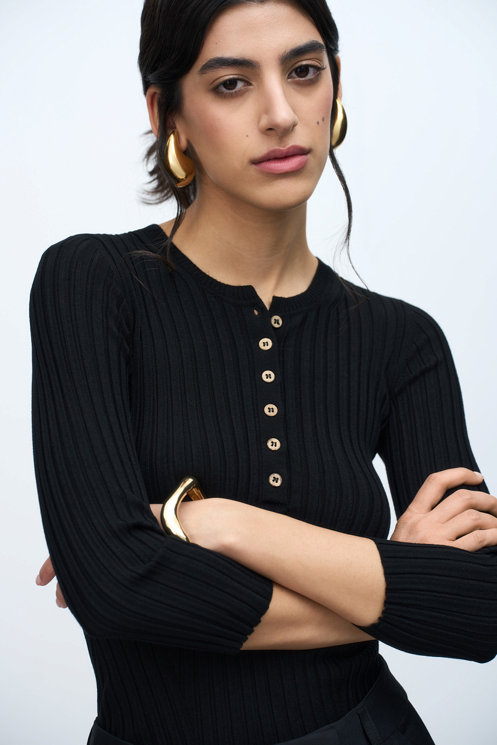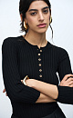 Wide rib-knit viscose jumper with 3/4 sleeves and button closure.