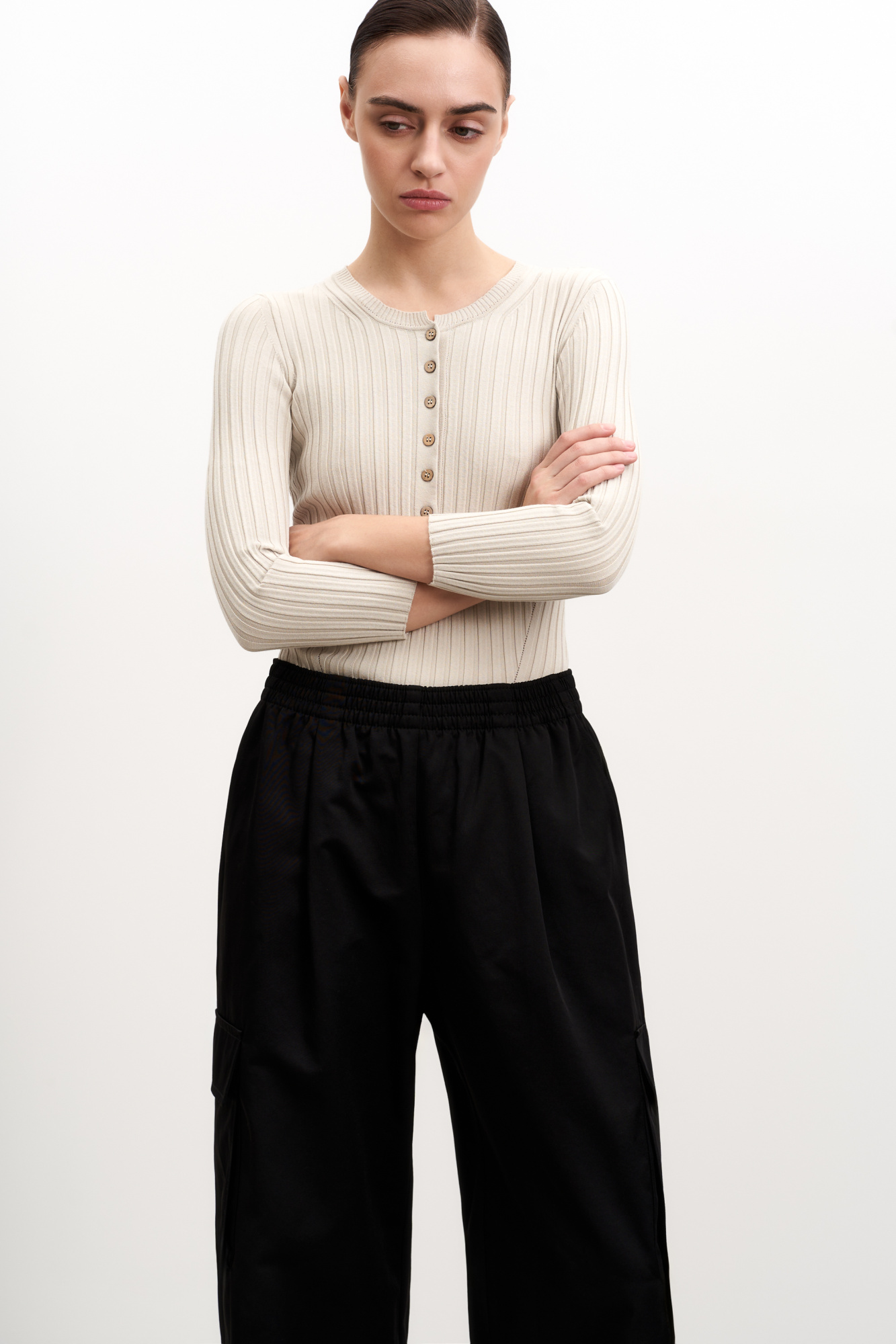 Wide rib-knit viscose jumper with 3/4 sleeves and button closure.