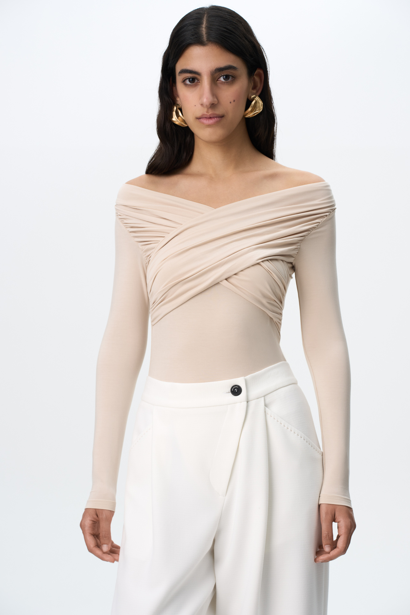 Fitted longline top with draped bodice made of soft and silky fabric with long sleeves.