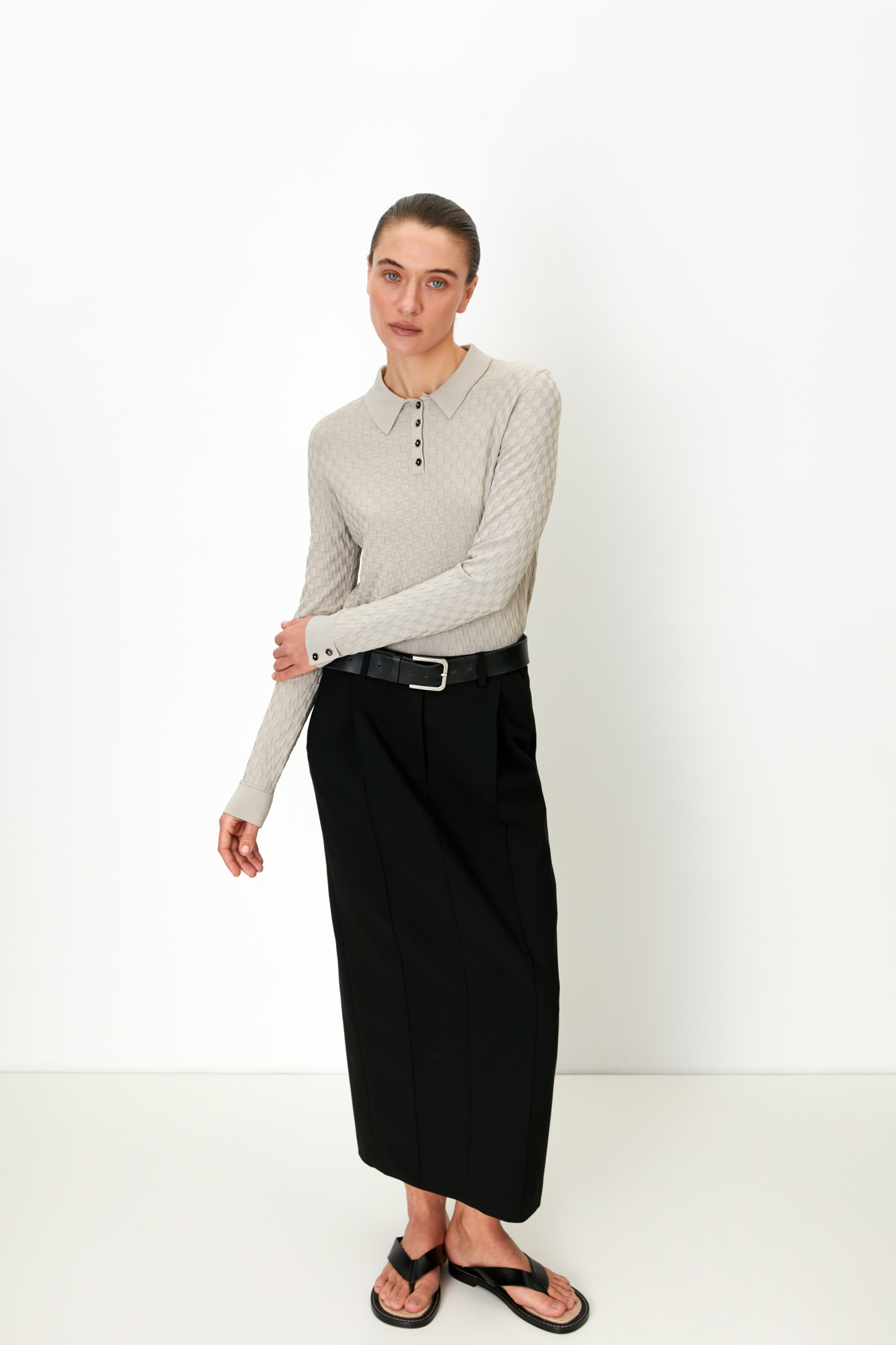 Polo T-shirt with long sleeves. Straight cut model features turn-down collar with buttons and buttoned cuffs.
