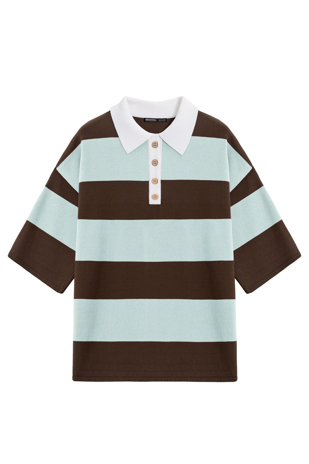 Knitted viscose polo shirt. Loose fit model with dropped shoulders and a turn-down collar with a V-neck.