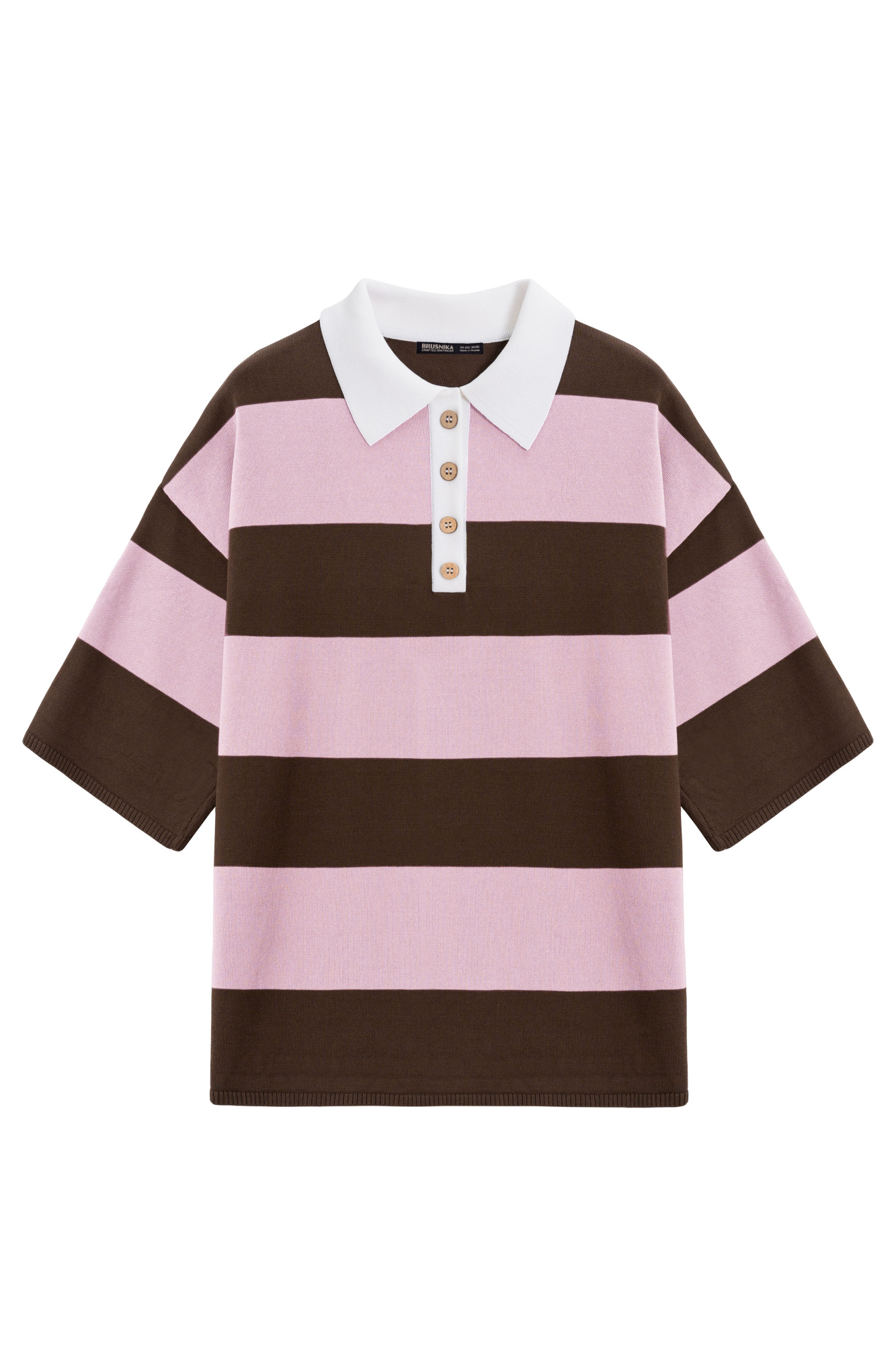 Knitted viscose polo shirt. Loose fit model with dropped shoulders and a turn-down collar with a V-neck.