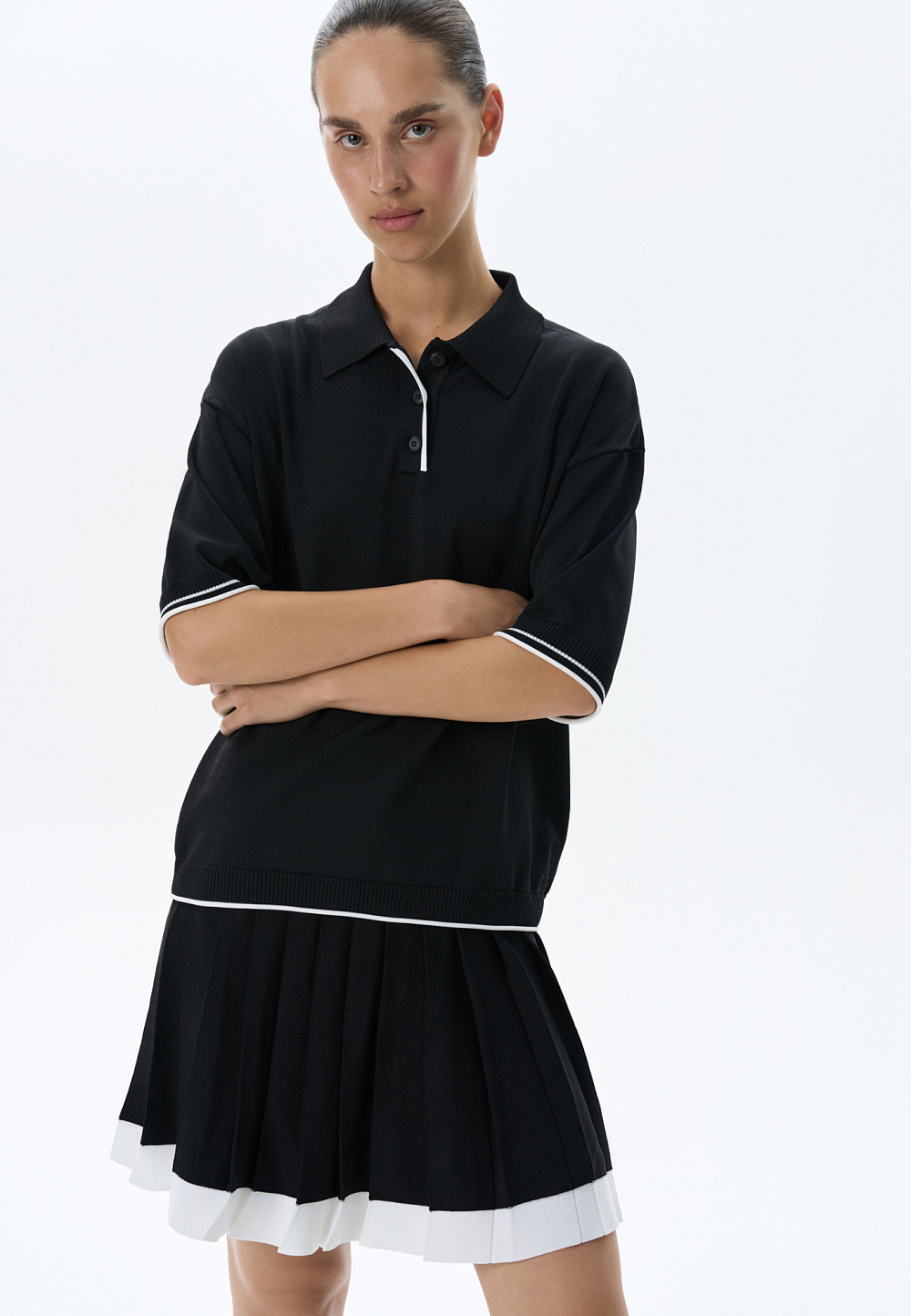 Knitted viscose polo shirt. The model features a straight silhouette, dropped shoulders, short sleeves, a turn-down polo collar and a three-button placket. The sleeves and bottom edge of the product are decorated with piping in a contrasting color.