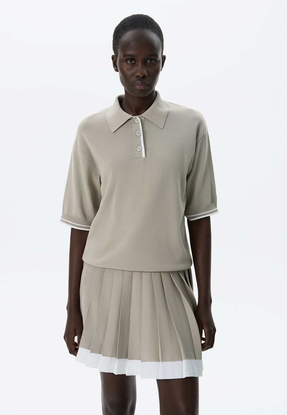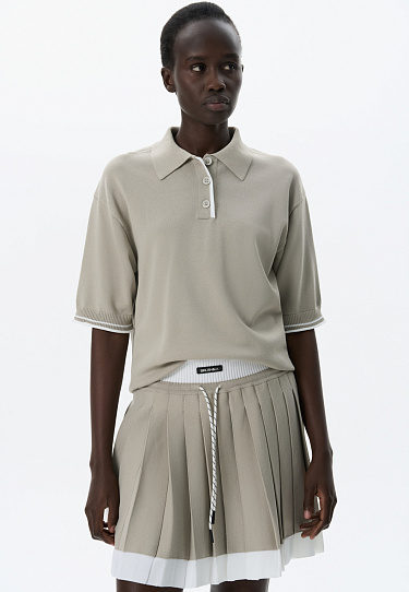 Knitted viscose polo shirt. The model features a straight silhouette, dropped shoulders, short sleeves, a turn-down polo collar and a three-button placket. The sleeves and bottom edge of the product are decorated with piping in a contrasting color.