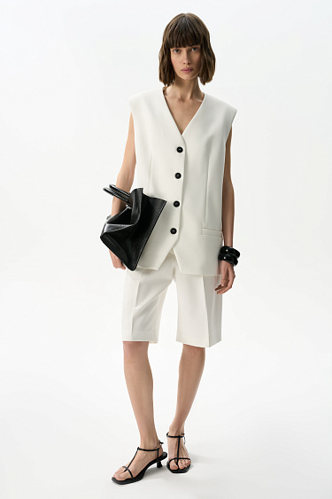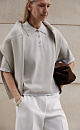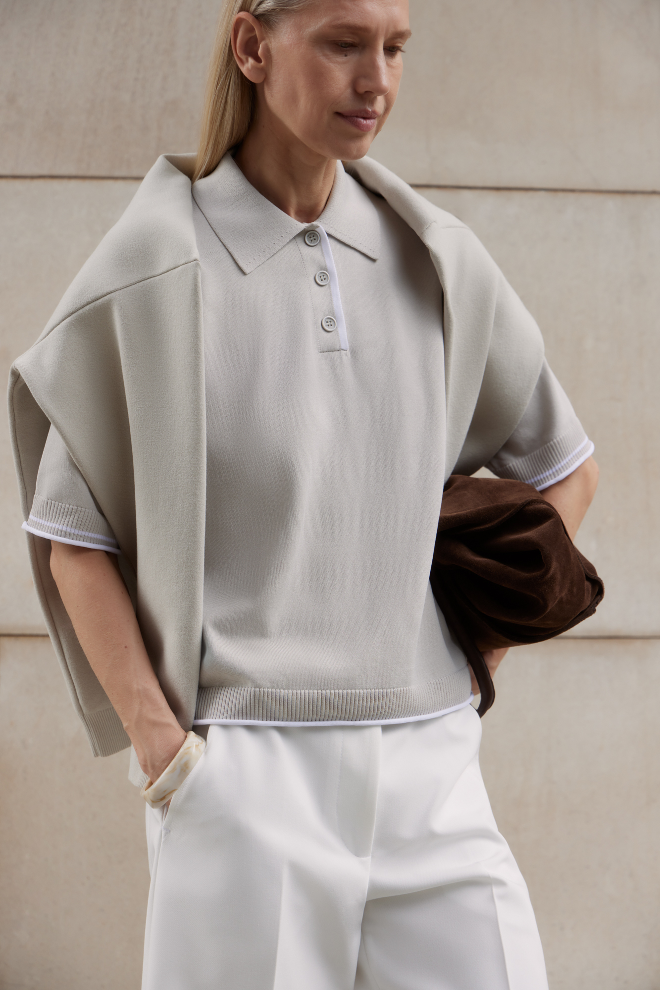 Knitted viscose polo shirt. The model features a straight silhouette, dropped shoulders, short sleeves, a turn-down polo collar and a three-button placket. The sleeves and bottom edge of the product are decorated with piping in a contrasting color.