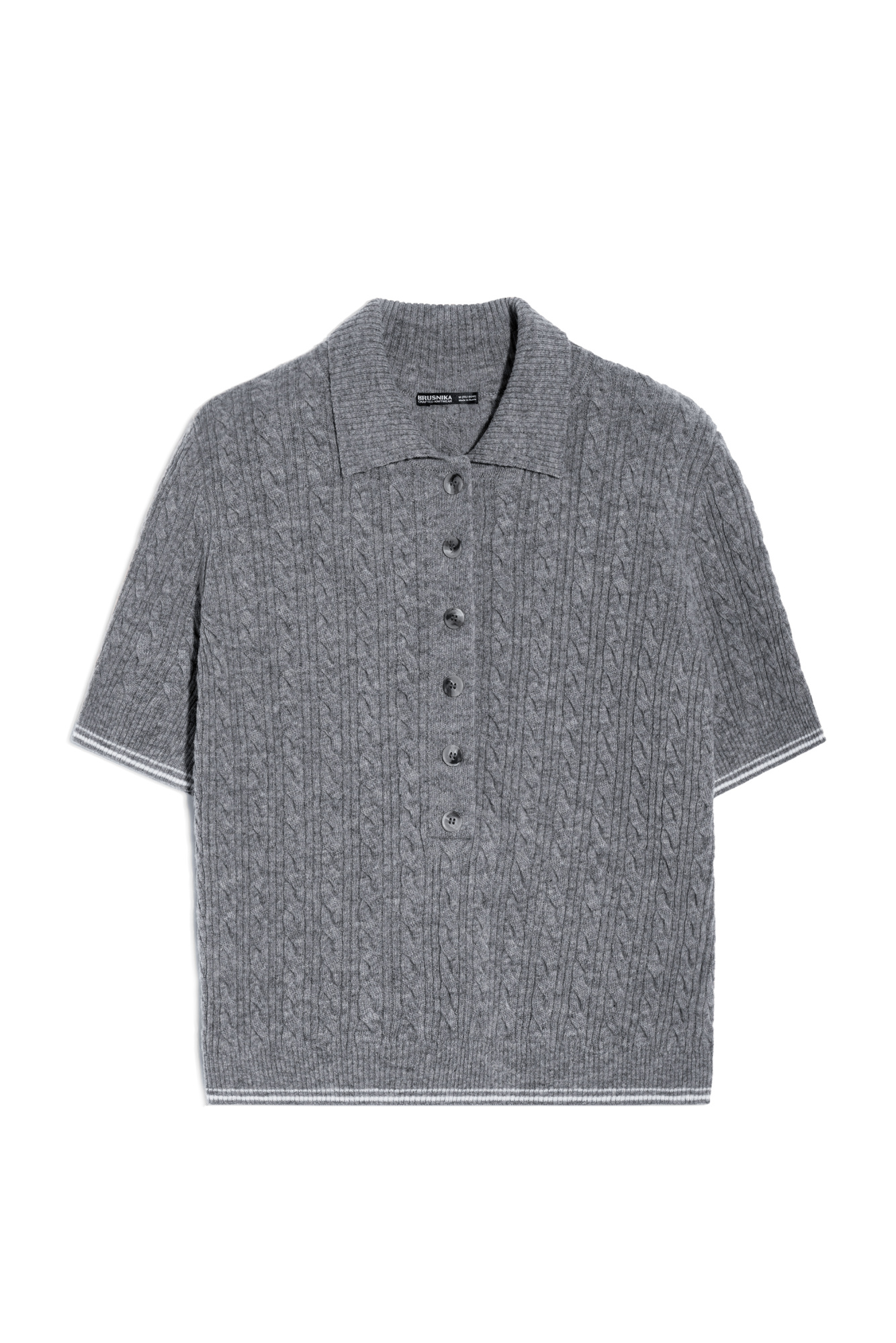 Knitted T-shirt made of 100% wool. Straight-cut model with a polo collar and button placket, the edges of the product are made with small rib.