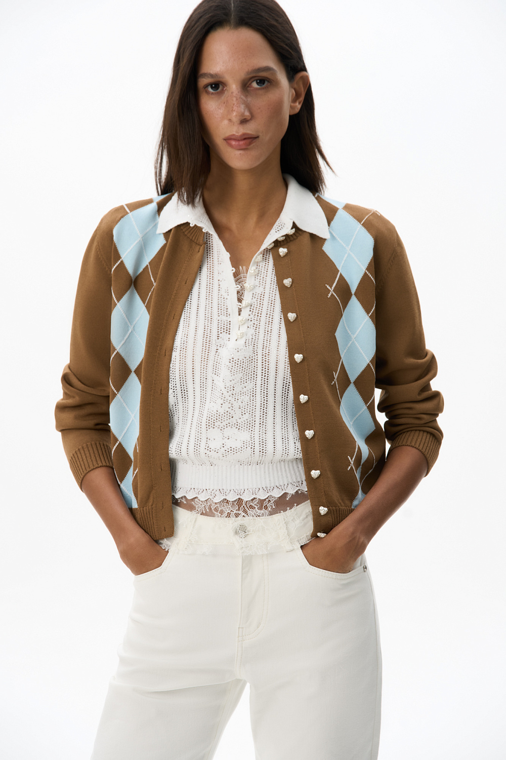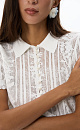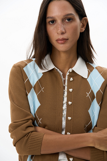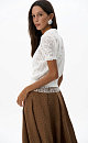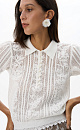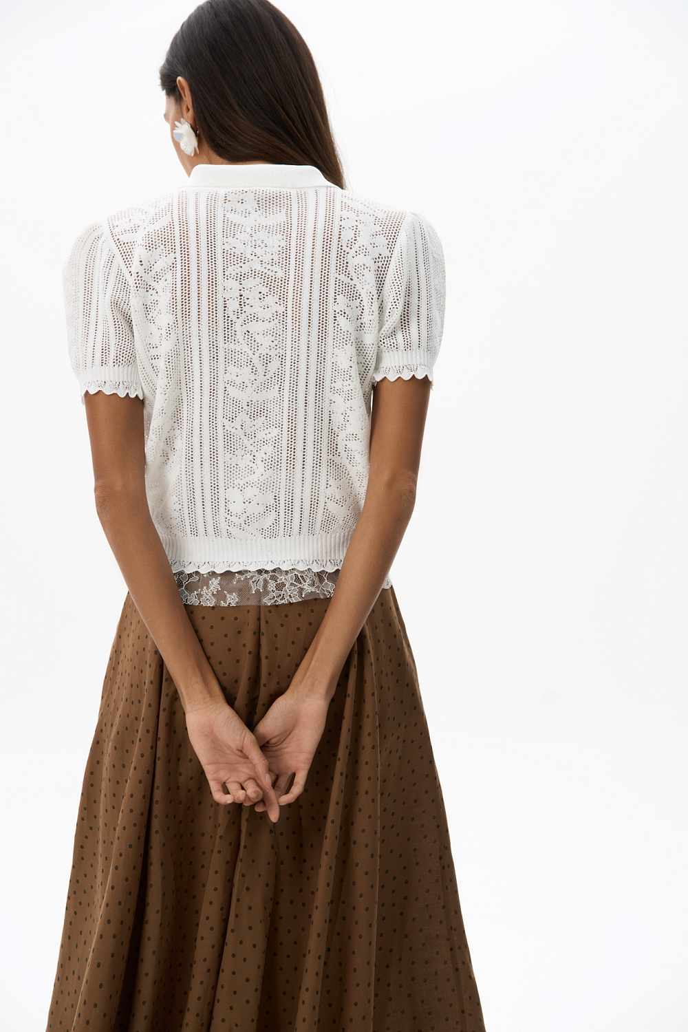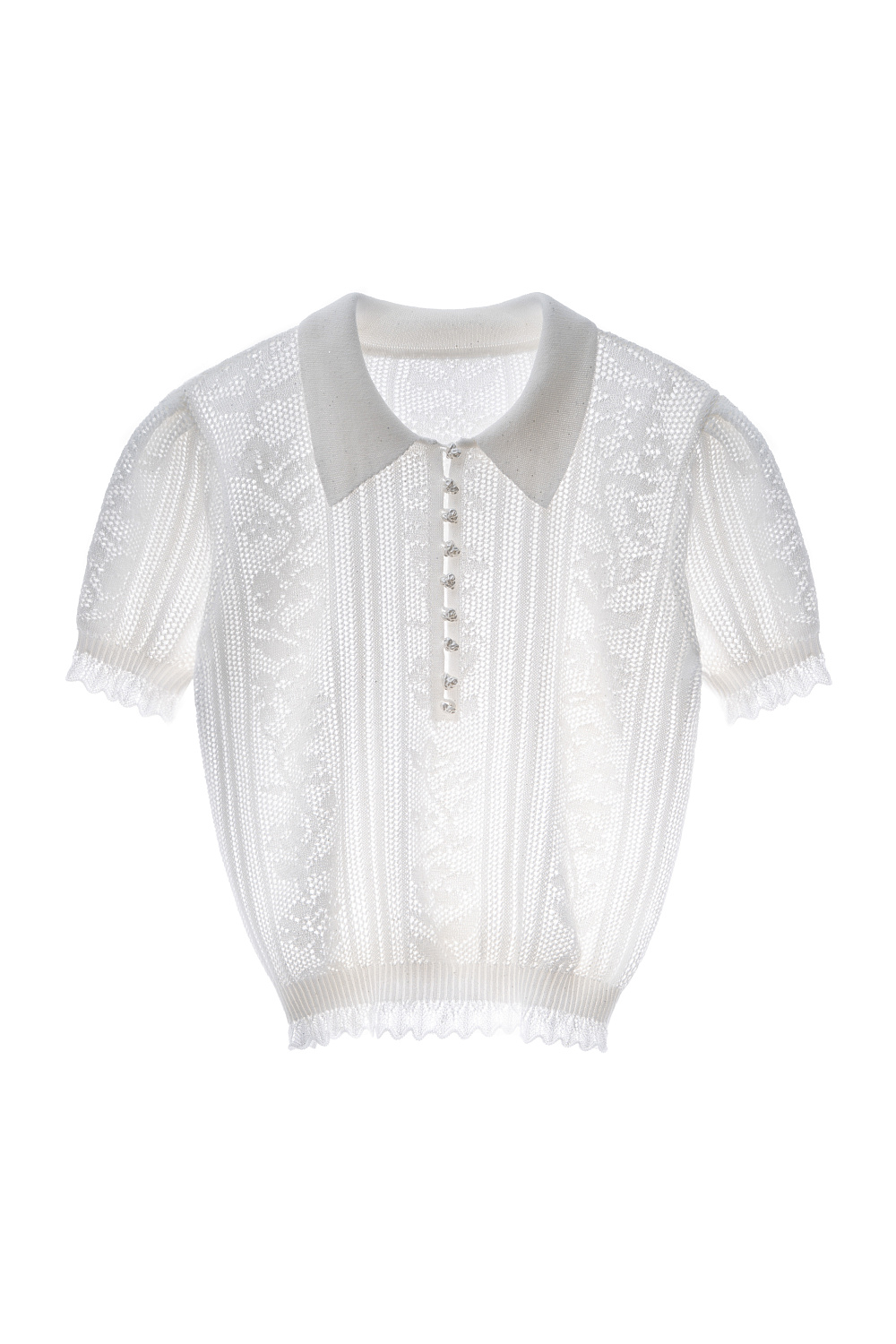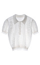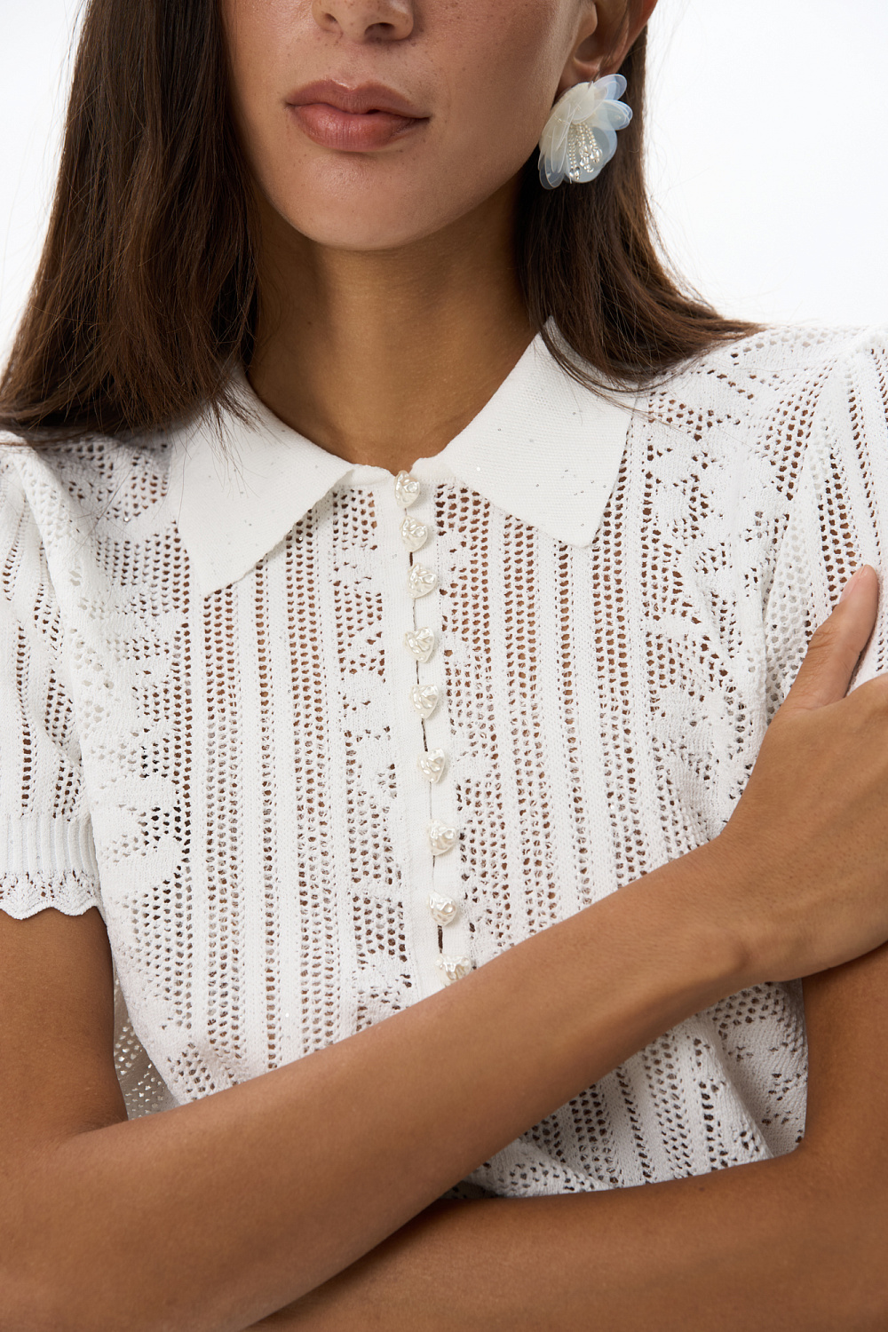 Knitted viscose T-shirt with sequins. The product is made of openwork weave with a design in the form of a floral ornament. Model with a polo collar, sweetheart button placket and short sleeves.