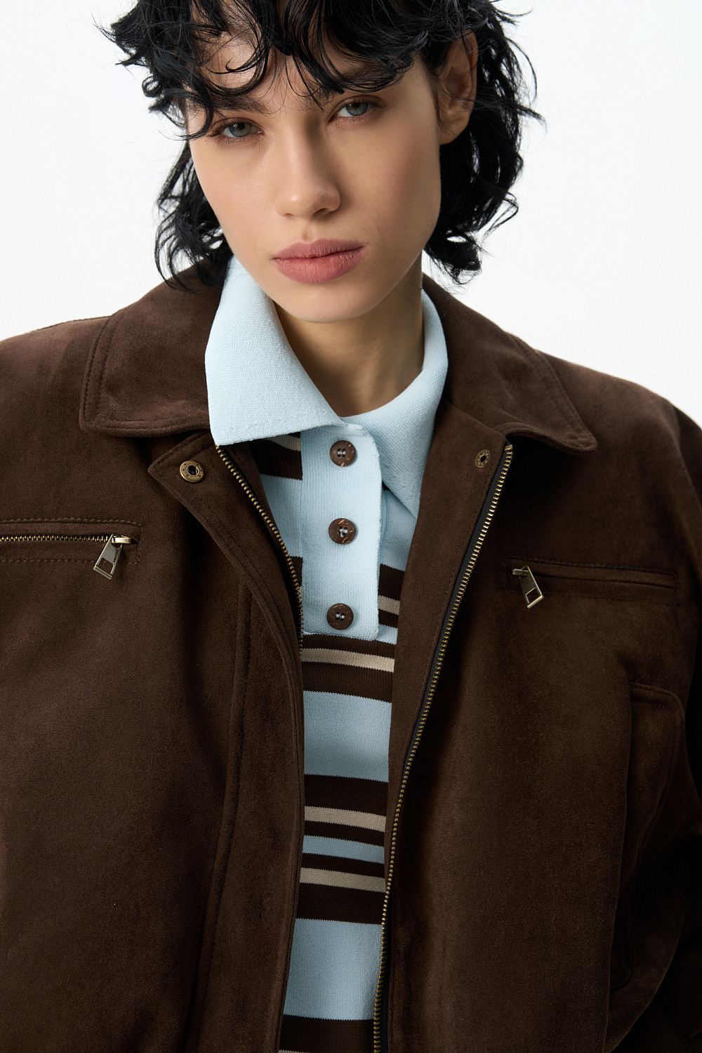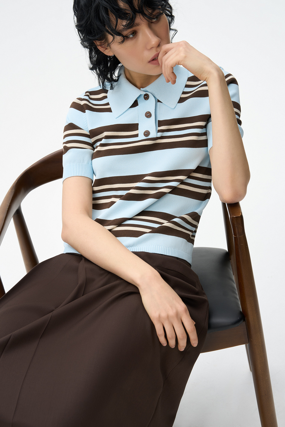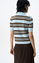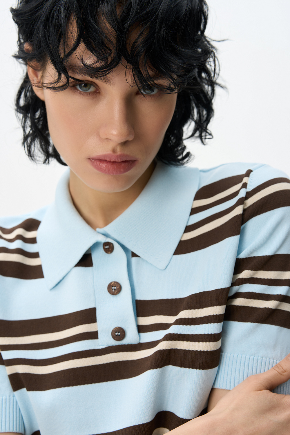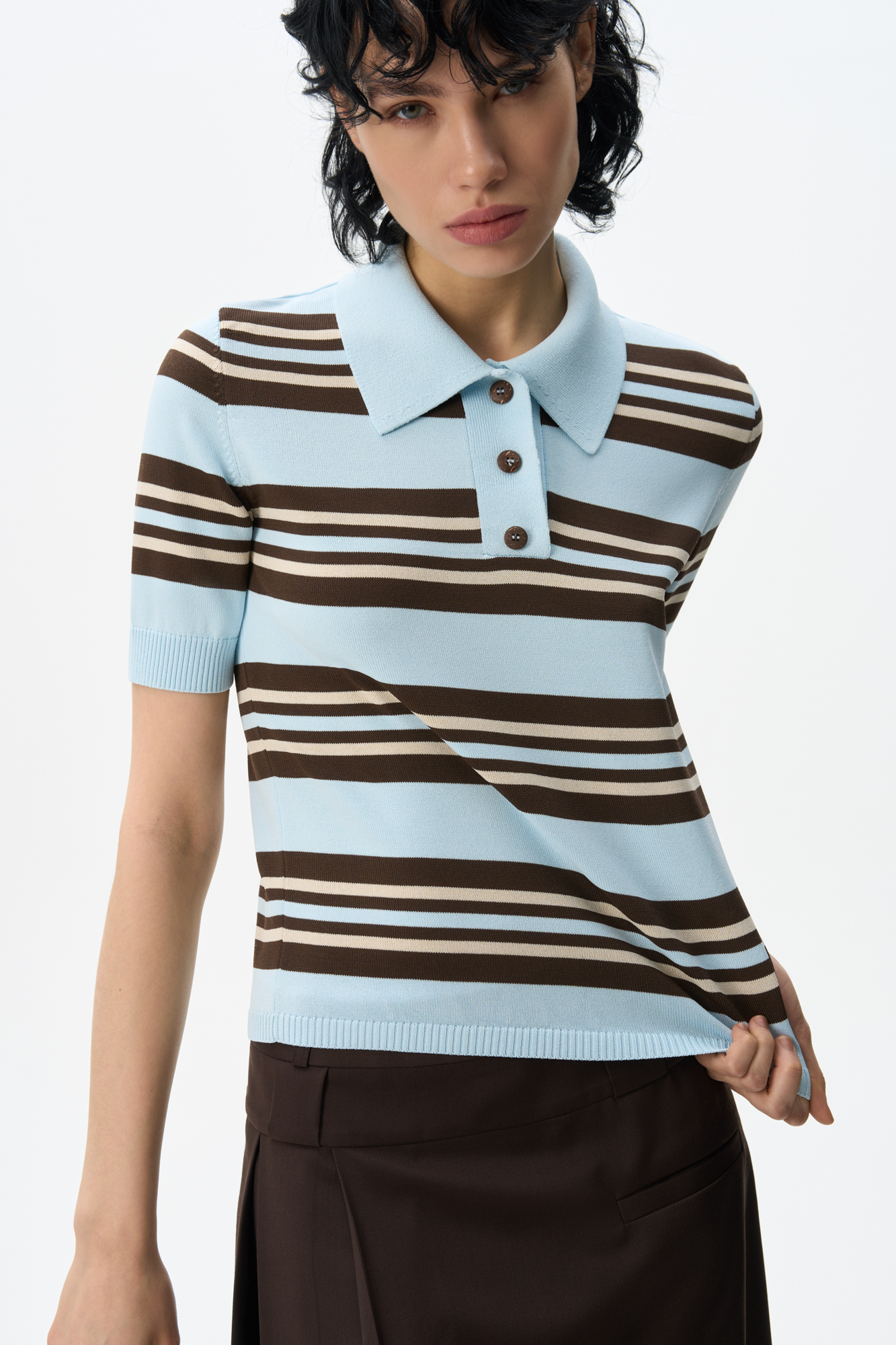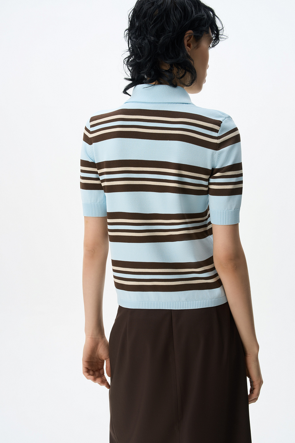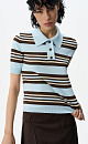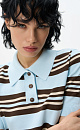 Knitted viscose striped polo shirt. Straight cut model with turn-down collar and buttons on the placket. The hem and sleeve cuffs are ribbed.