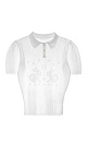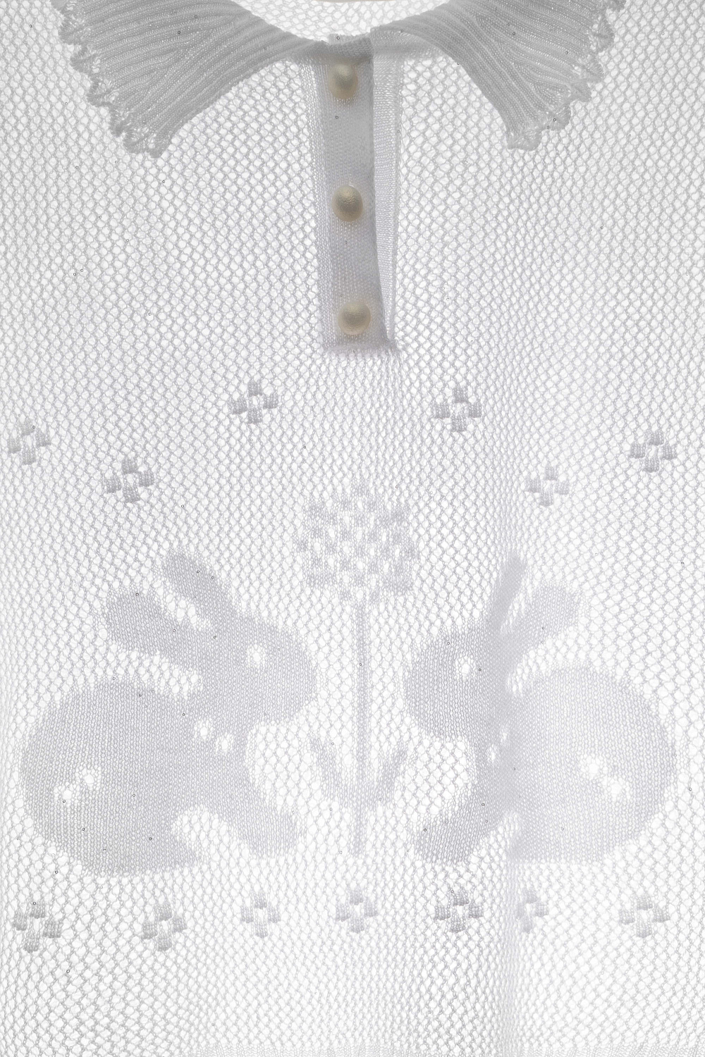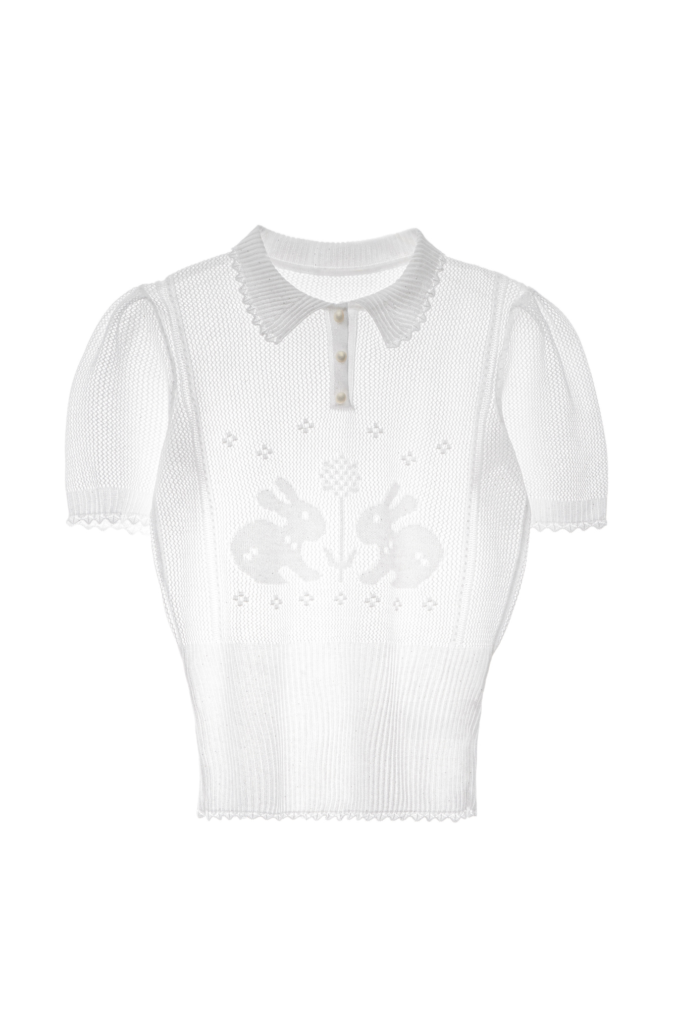 Knitted viscose T-shirt. The product is made of openwork weave with a rabbit design. Model with a polo collar, button placket and short puff sleeves.