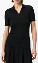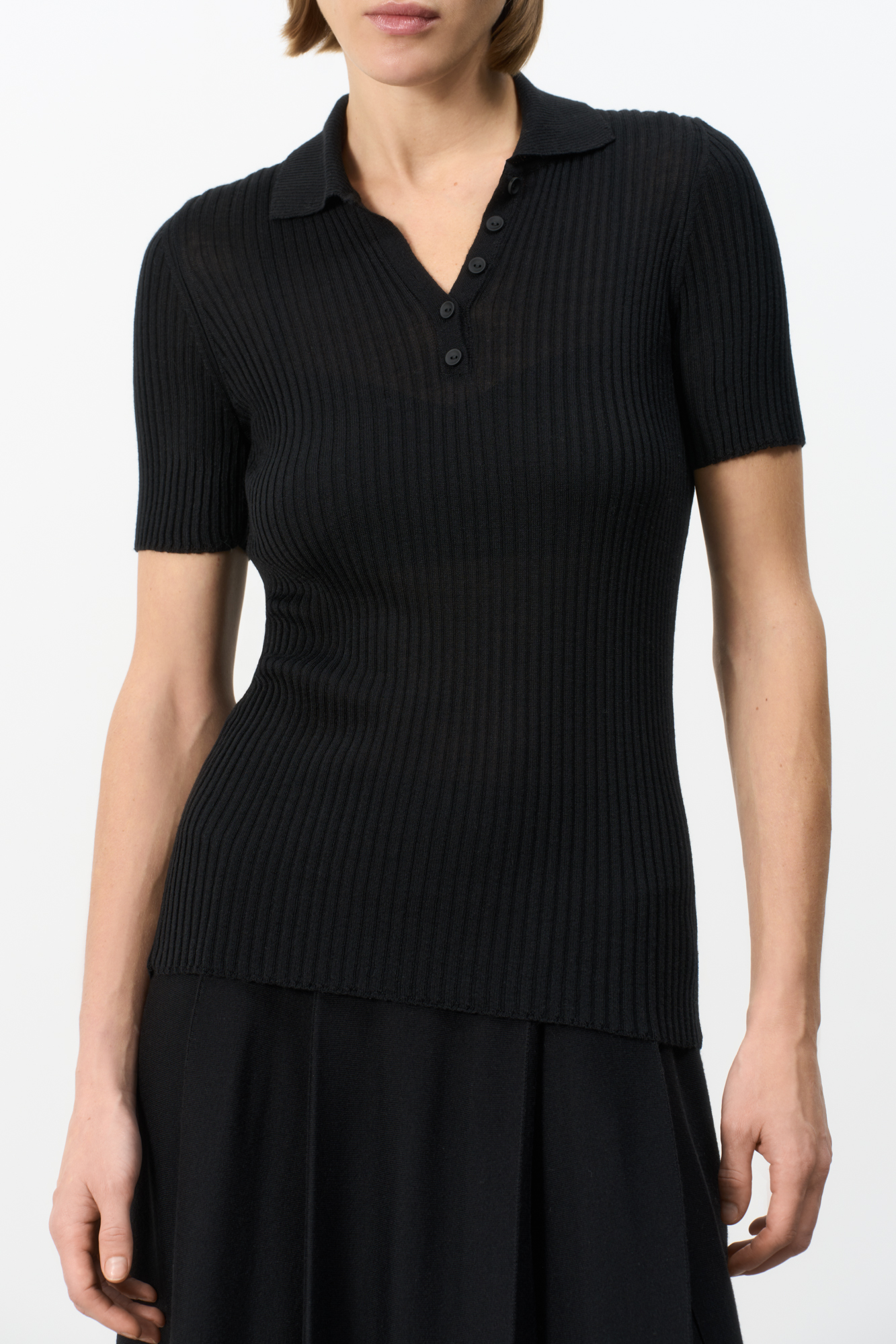 Wool blend knitted polo. The model has a fitted silhouette, short sleeves, a turn-down collar and a button closure on the placket.