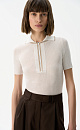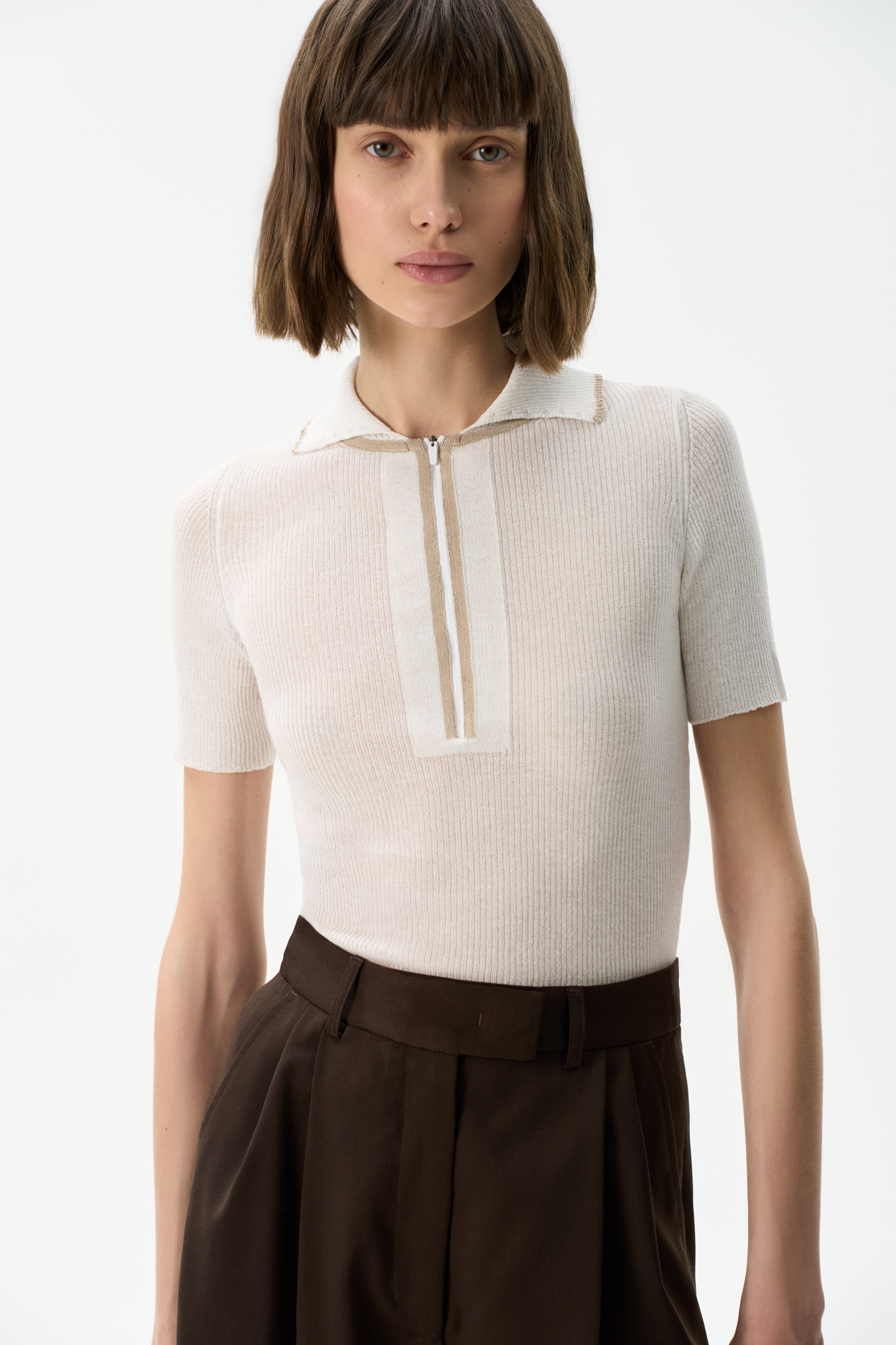 100% cotton knitted polo shirt. The model has a fitted silhouette, short sleeves, a turn-down collar and a hidden zipper. The product is decorated with beige trim on the collar and along the placket.