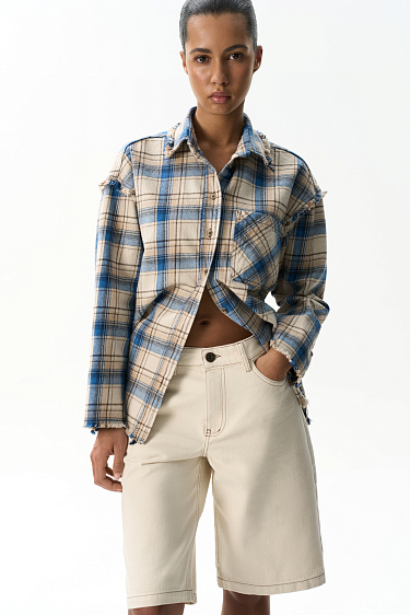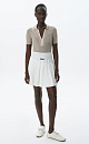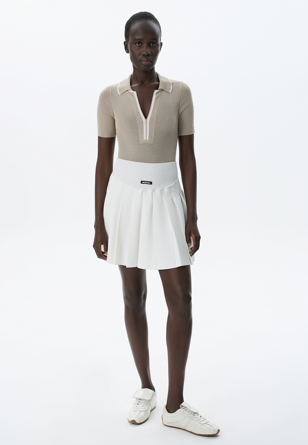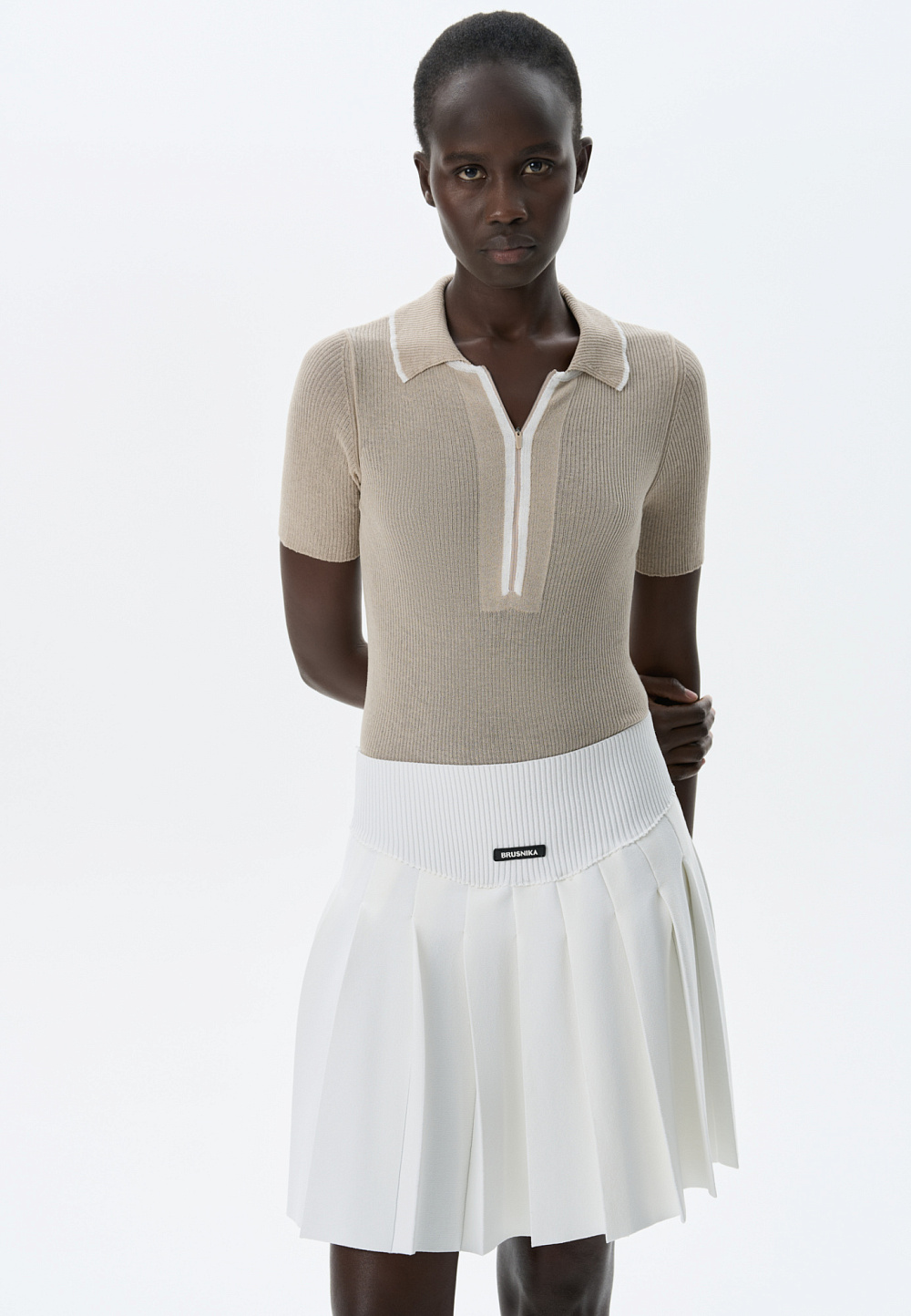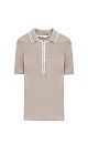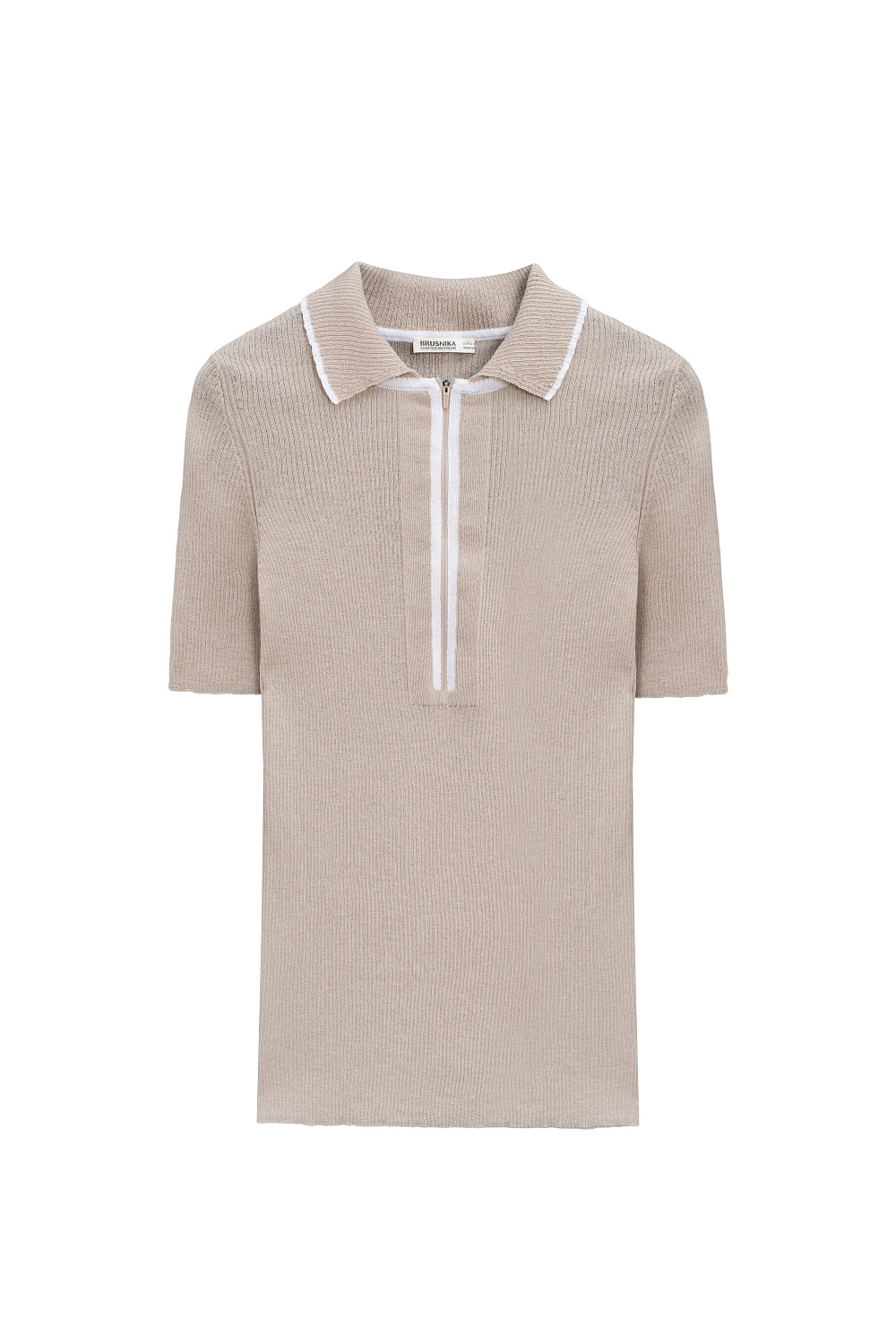 100% cotton knitted polo shirt. The model has a fitted silhouette, short sleeves, a turn-down collar and a hidden zipper. The product is decorated with beige trim on the collar and along the placket.