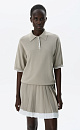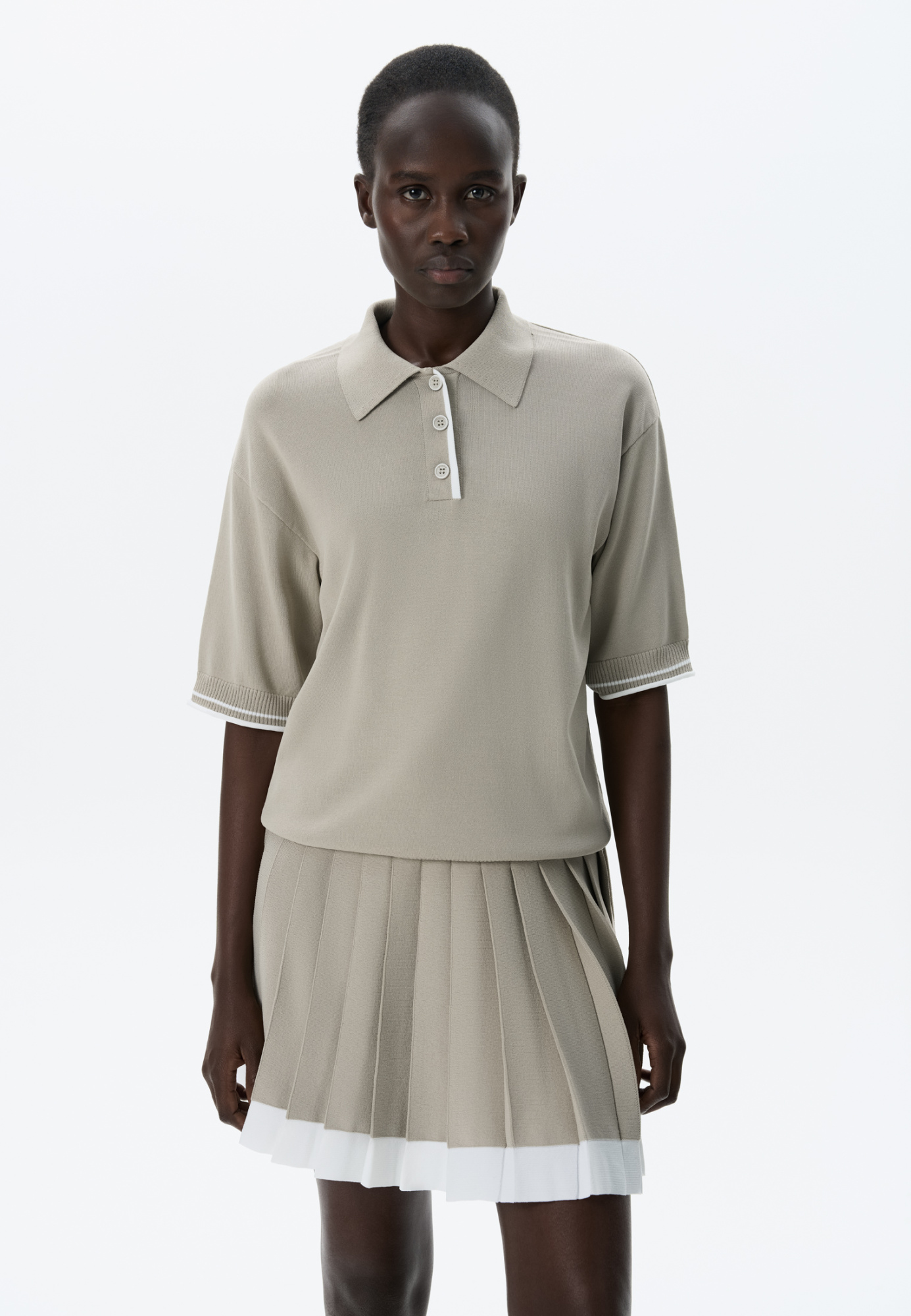 Knitted viscose polo shirt. The model features a straight silhouette, dropped shoulders, short sleeves, a turn-down polo collar and a three-button placket. The sleeves and bottom edge of the product are decorated with piping in a contrasting color.