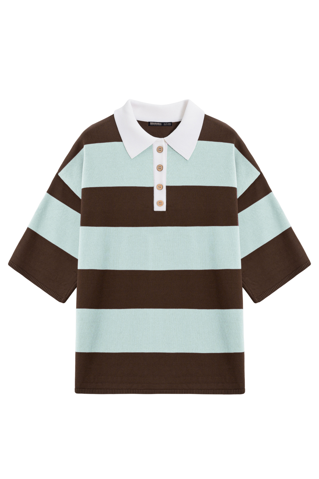 Knitted viscose polo shirt. Loose fit model with dropped shoulders and a turn-down collar with a V-neck.