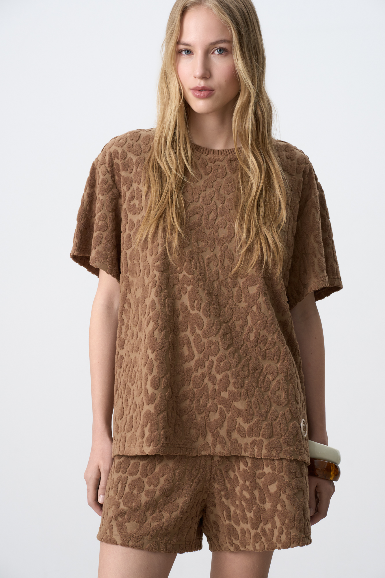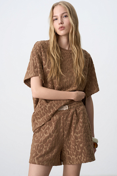 Long T-shirt in terry jersey. Loose silhouette model with dropped shoulder line. You can complement the look with shorts in the same style.