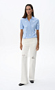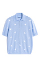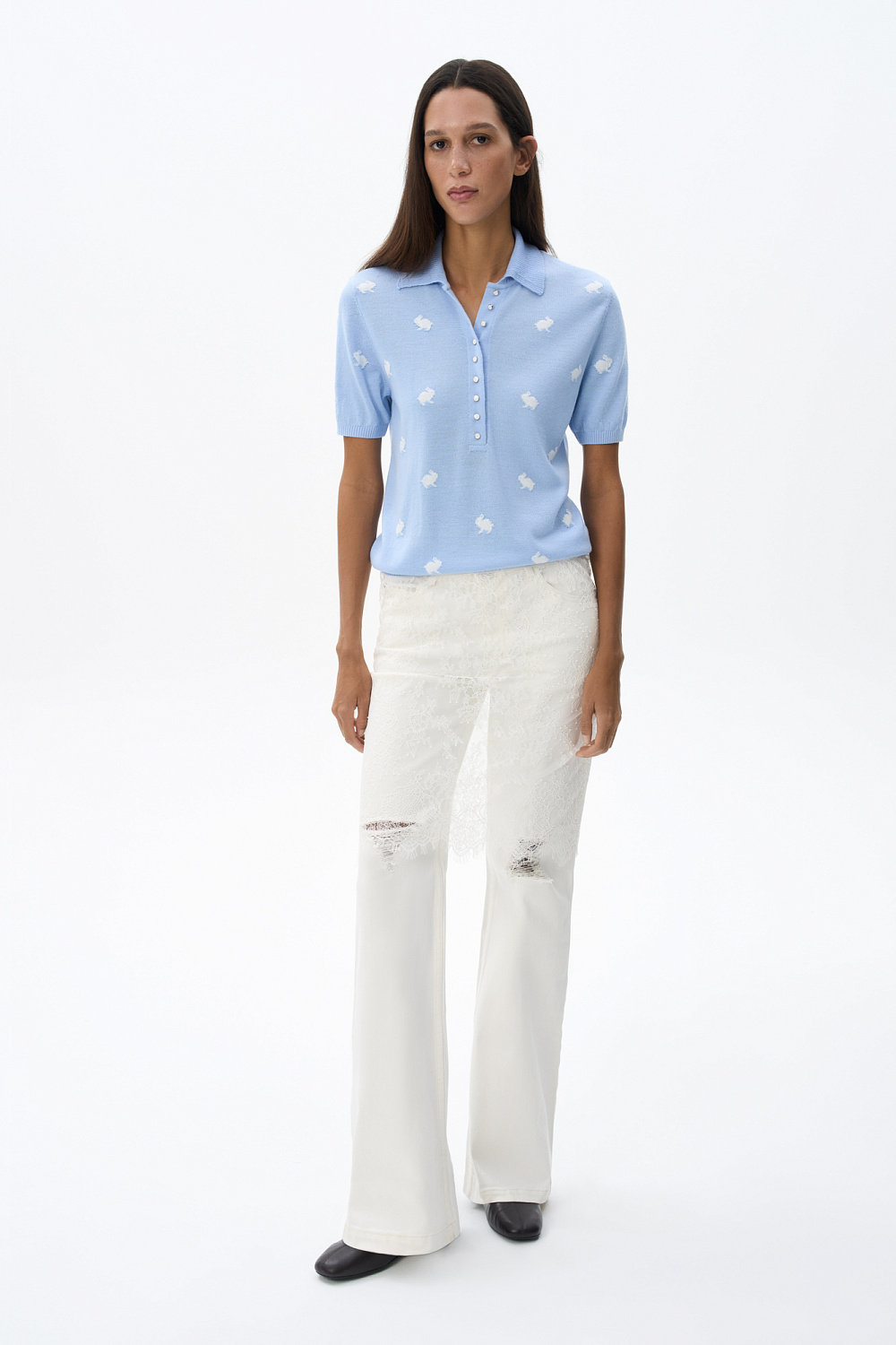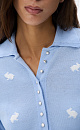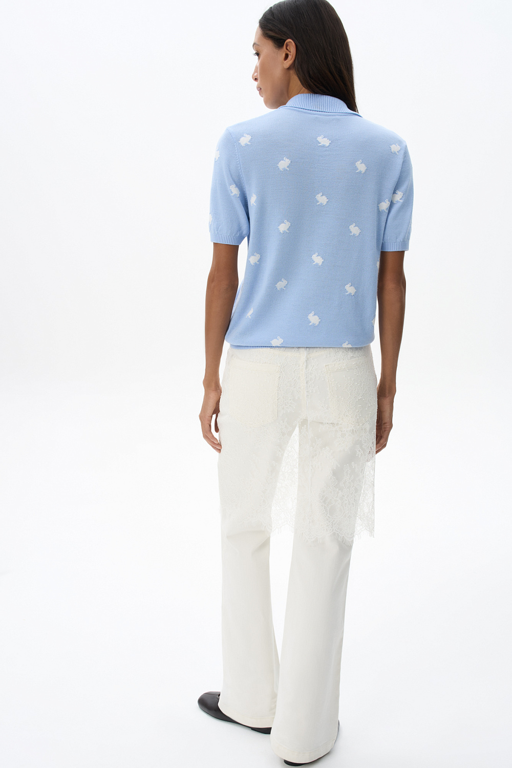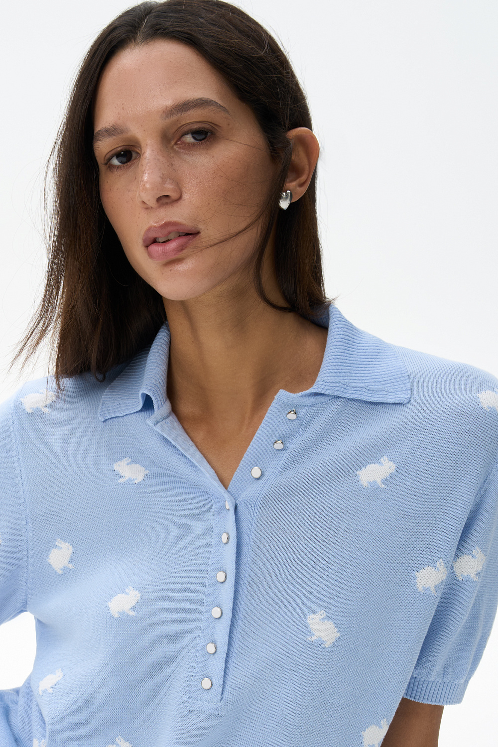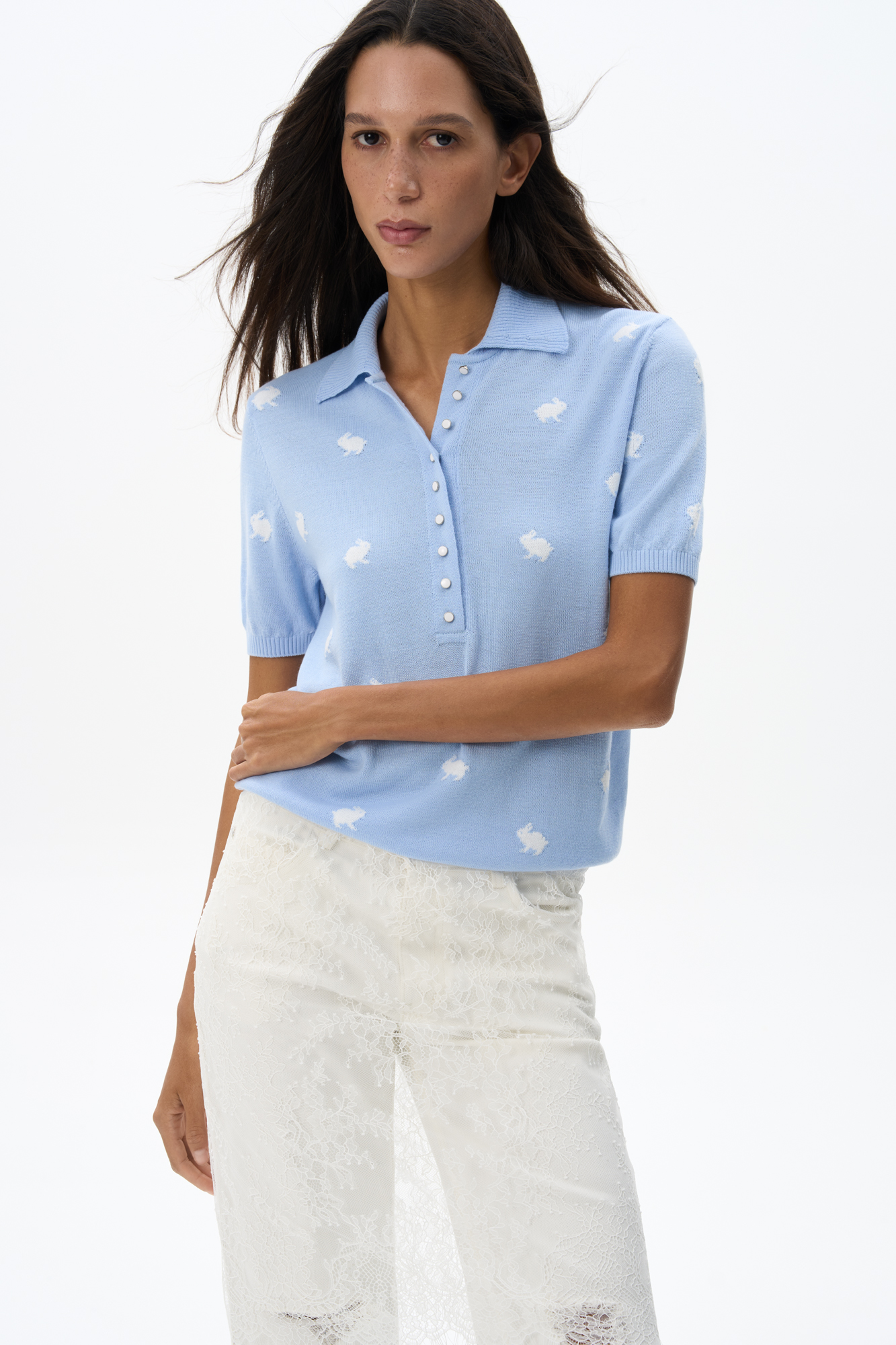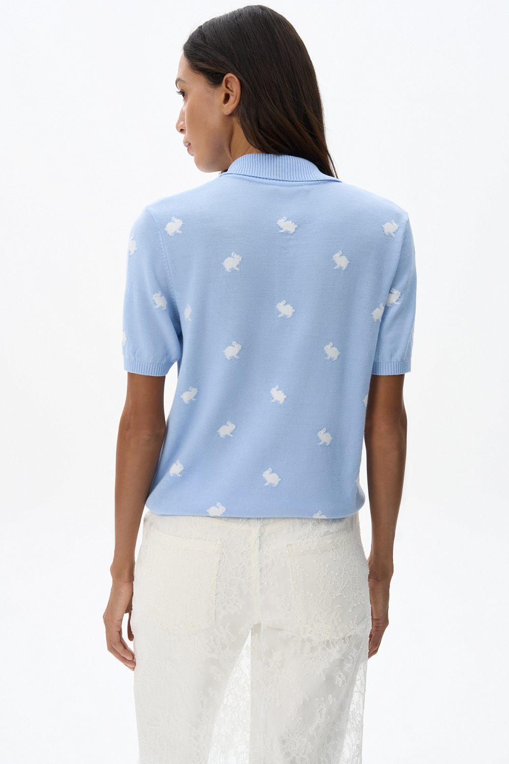 Knitted wool T-shirt. A loose fit model with a polo collar and small button closure on the placket. The product is decorated with jacquard in the shape of bunnies.