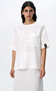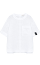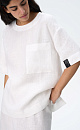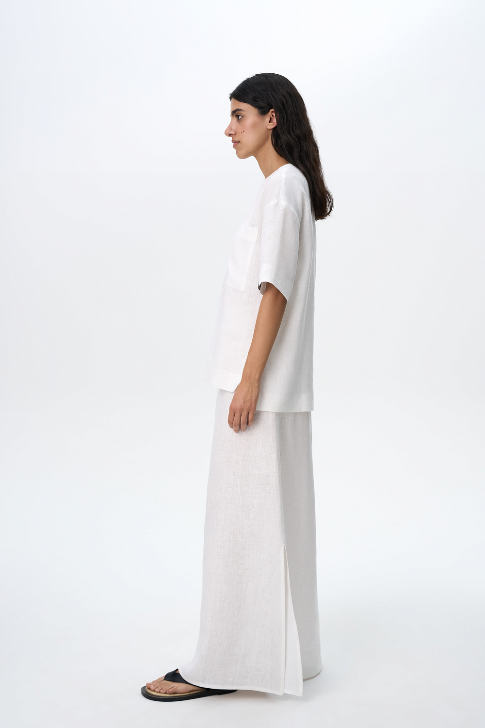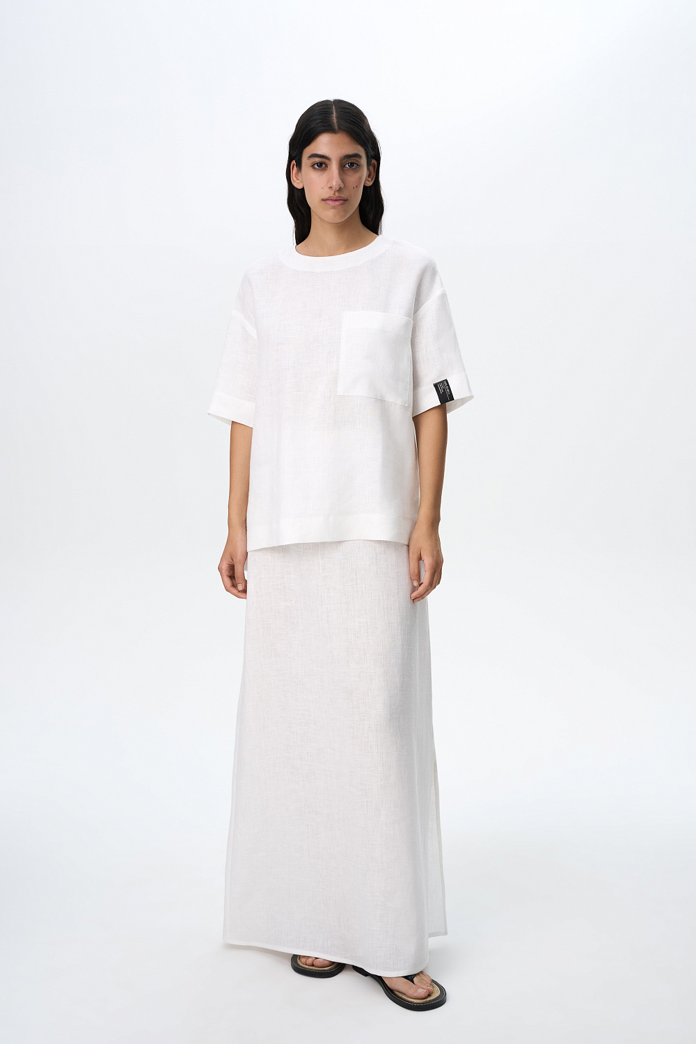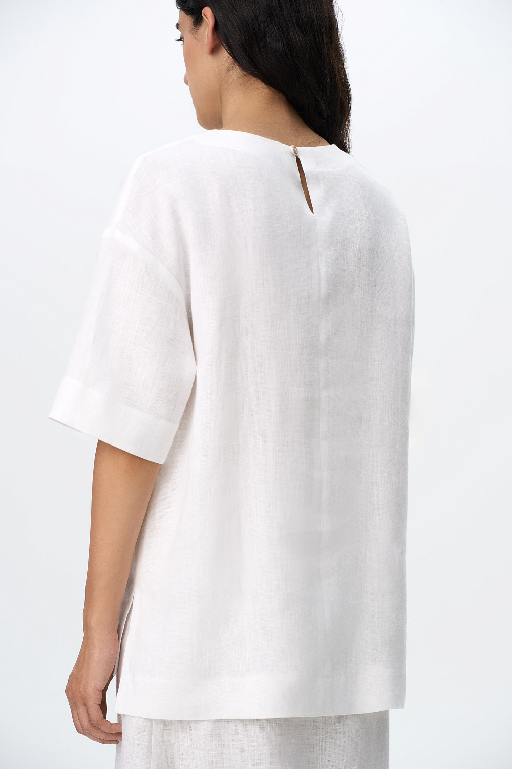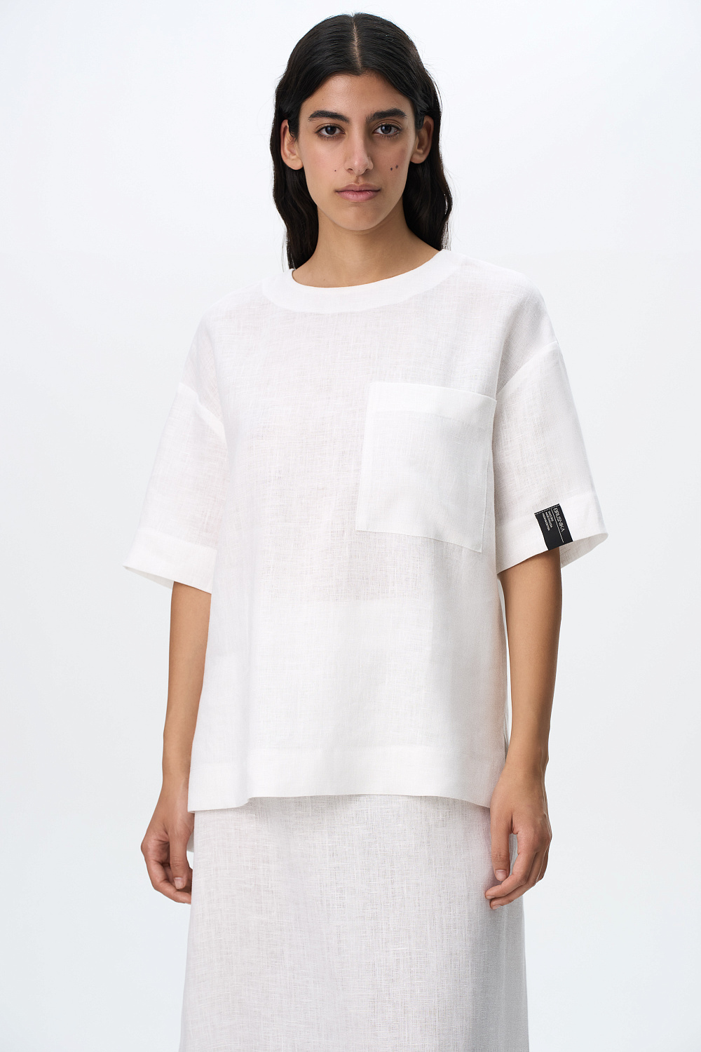 Wide 100% linen T-shirt with dropped shoulders and asymmetrical hem with slits on the sides. Round neckline, patch pocket and branded label at sleeve. Button fastening at the back.