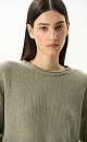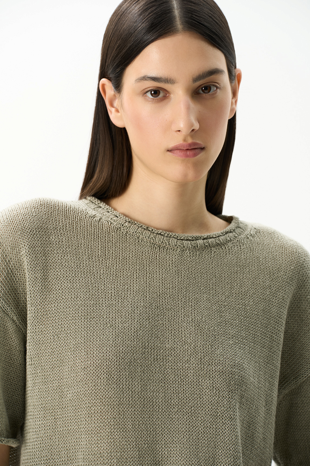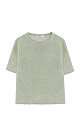 Knitted T-shirt made of 100% linen. Loose silhouette model with dropped shoulders, short sleeves and round neckline.