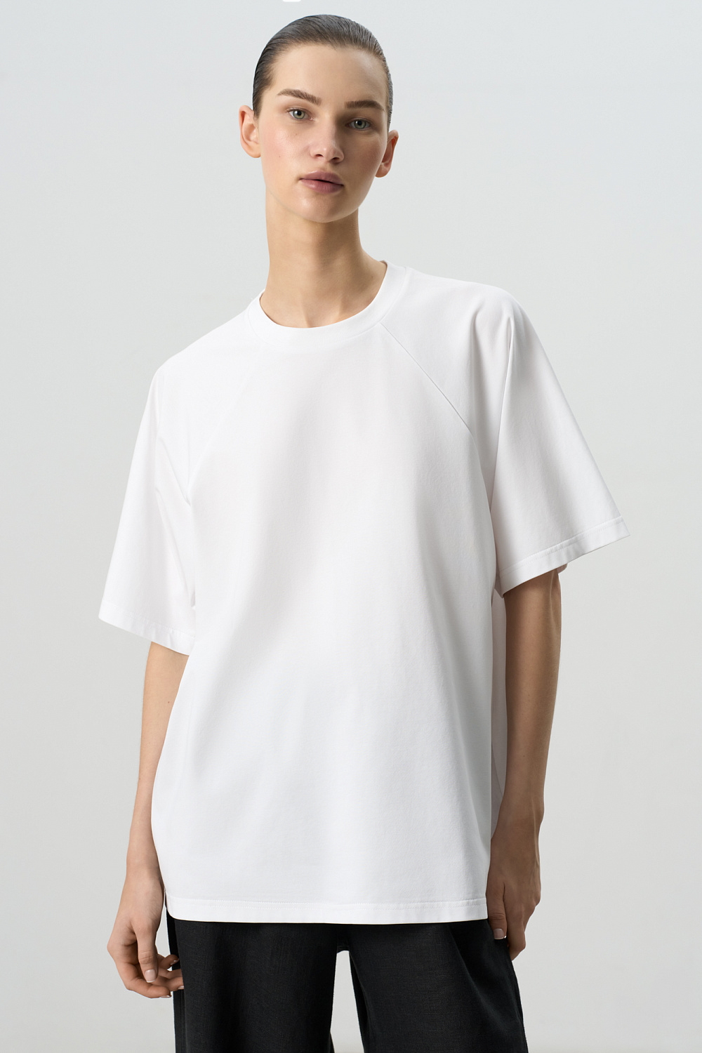 T-shirt made of cotton with the addition of soron. Straight cut model with round neckline and raglan sleeves.