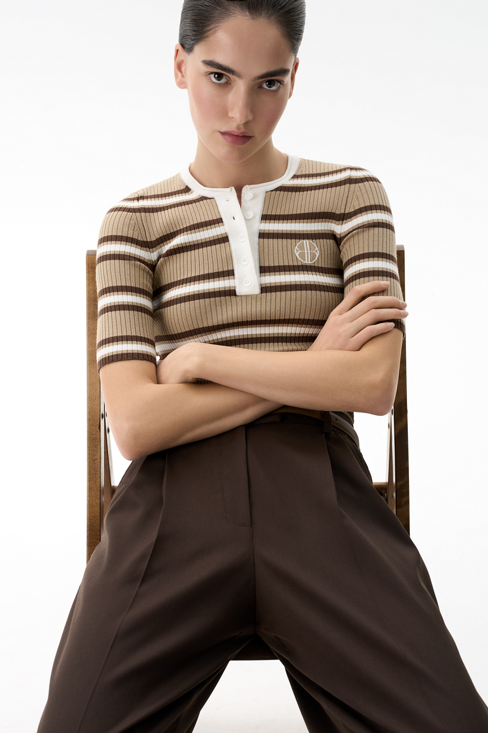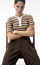 Viscose striped T-shirt. Short sleeve, round neckline and button placket. With a branded label on the chest.