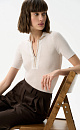 100% cotton knitted polo shirt. The model has a fitted silhouette, short sleeves, a turn-down collar and a hidden zipper. The product is decorated with beige trim on the collar and along the placket.