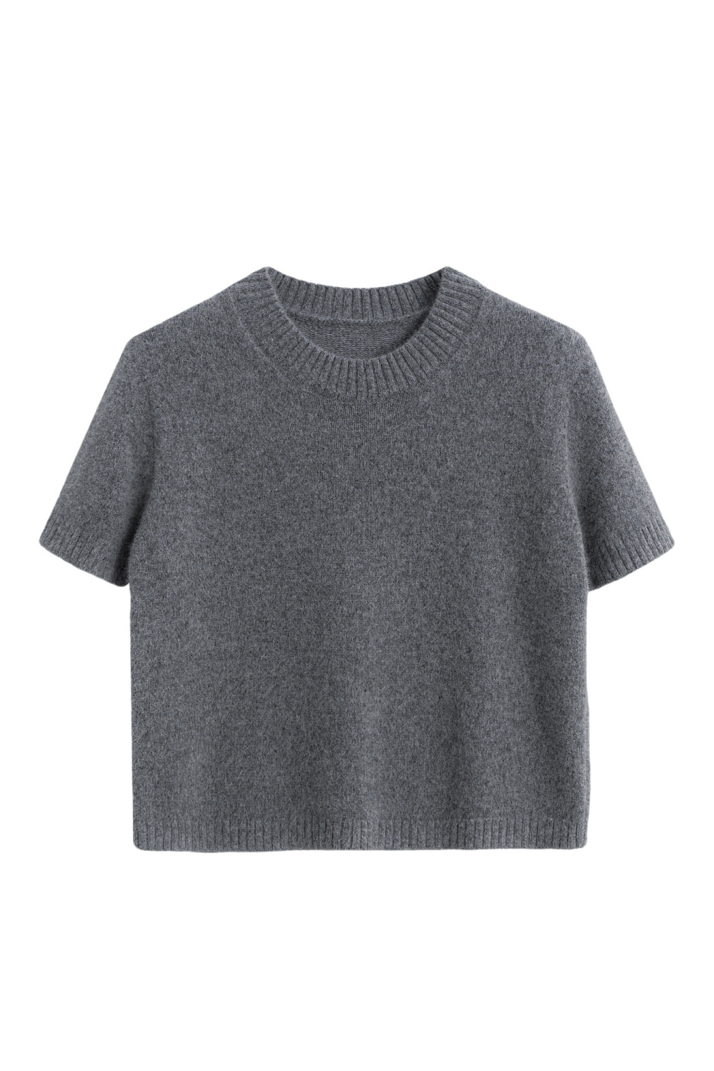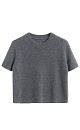 Knitted fox fur T-shirt. Model of a loose silhouette, with short sleeves and a round neckline. The edges of the product are ribbed. You can complement the look with a skirt.