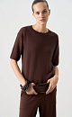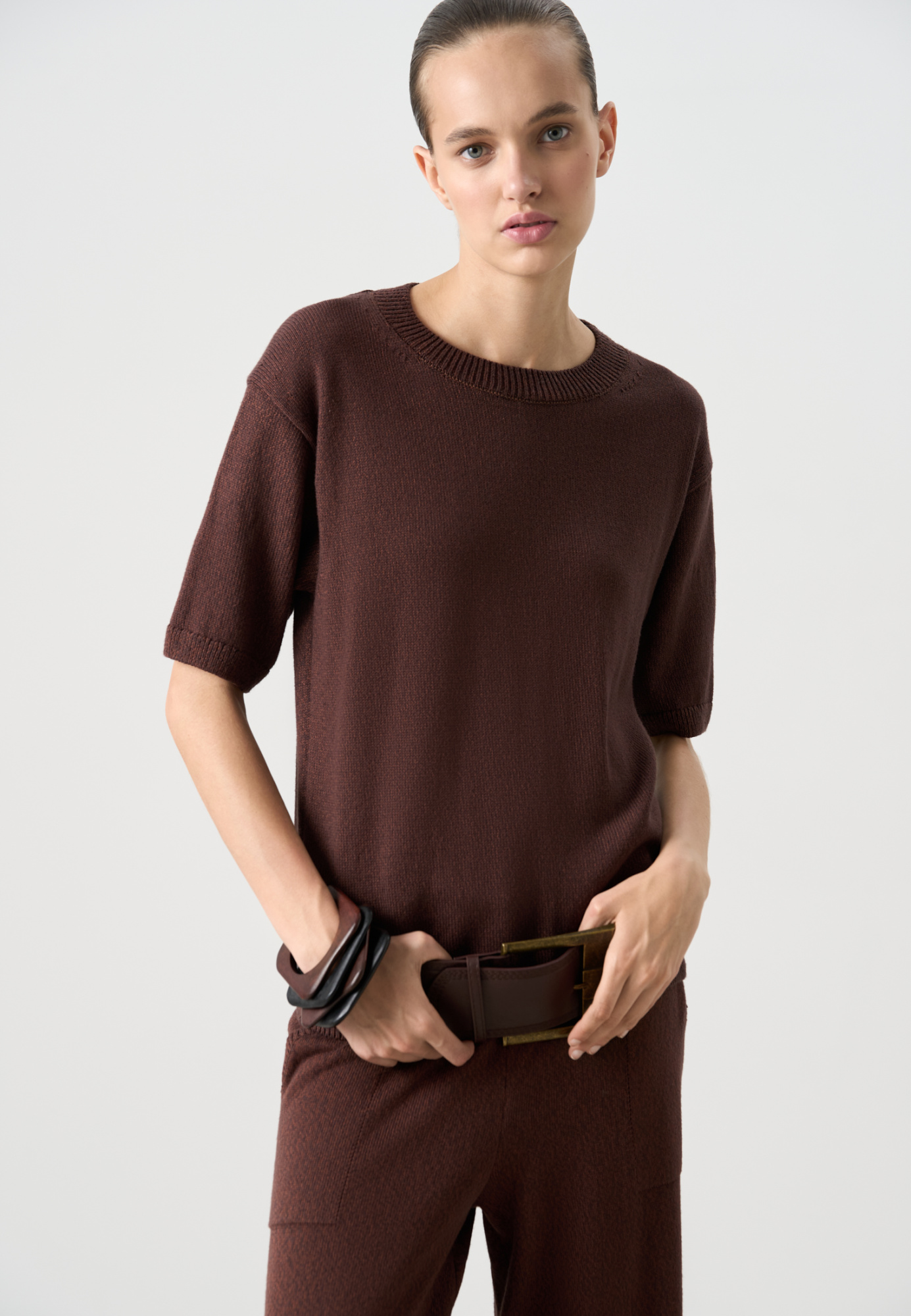 Knitted T-shirt made of cotton with added viscose. The model has a loose silhouette, with dropped shoulders and a round neckline. The edges of the product are ribbed.