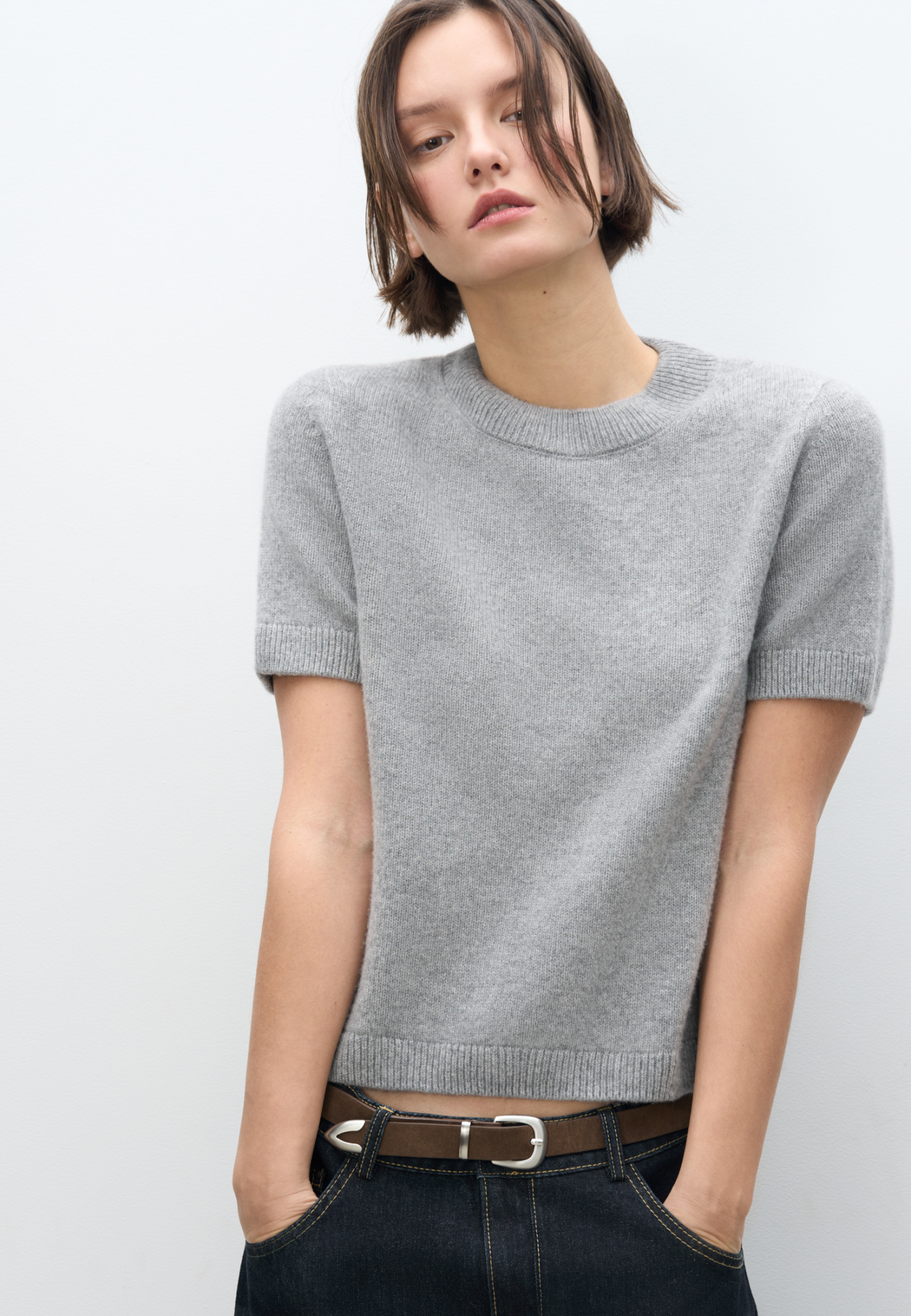 Knitted T-shirt made of 100% cashmere. Model of a loose silhouette, with short sleeves and a round neckline. The edges of the product are ribbed.