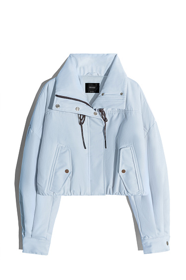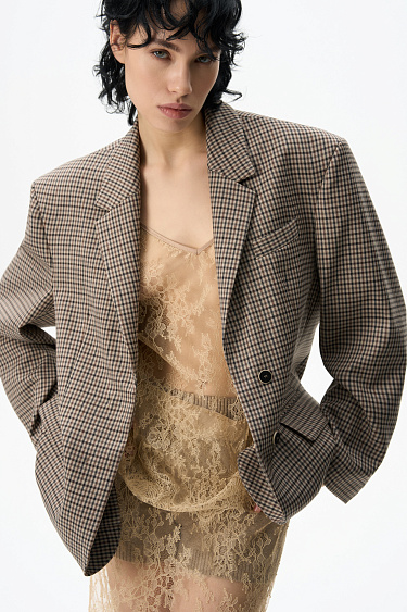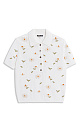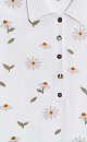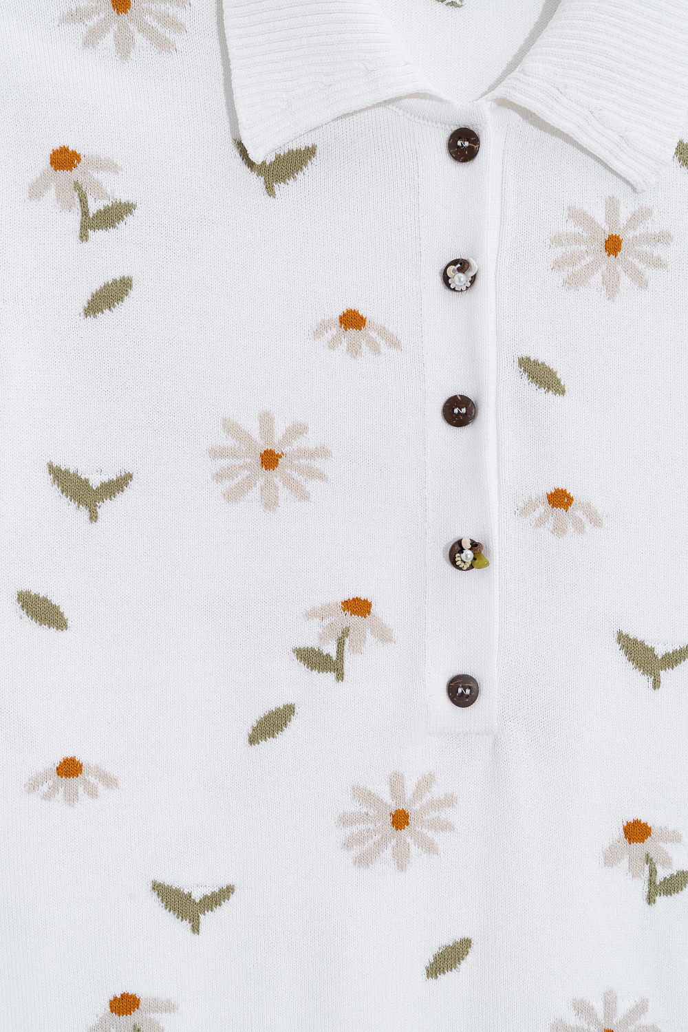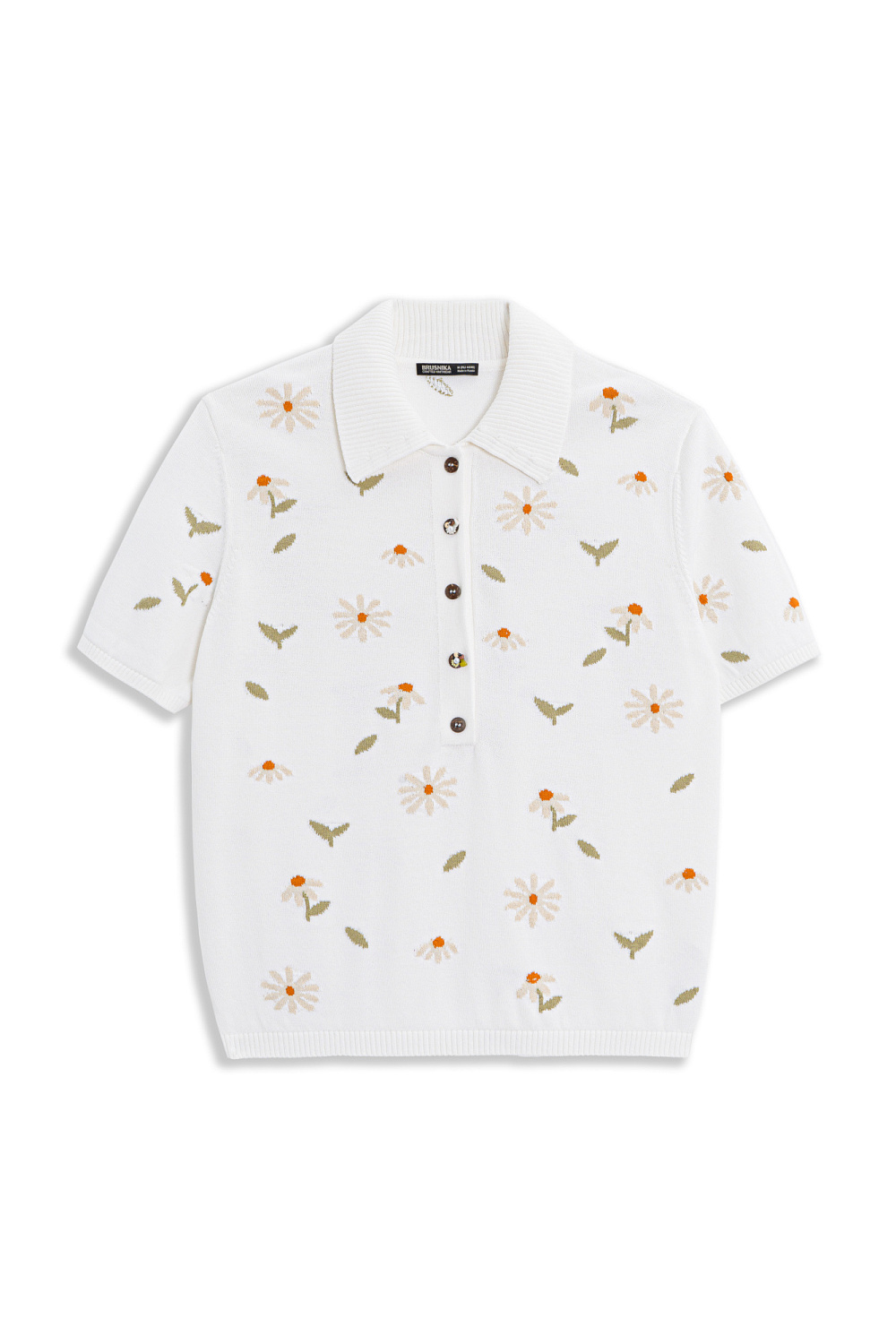 Knitted viscose T-shirt with a floral jaccarge pattern. Model with polo collar, beaded button placket and short sleeves.