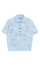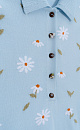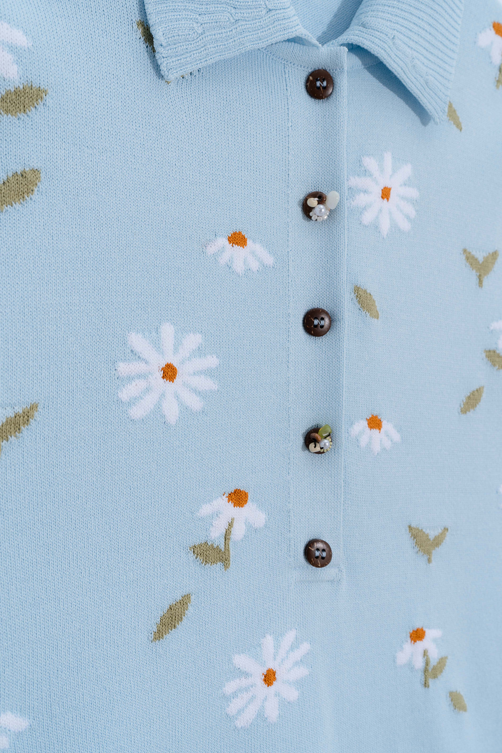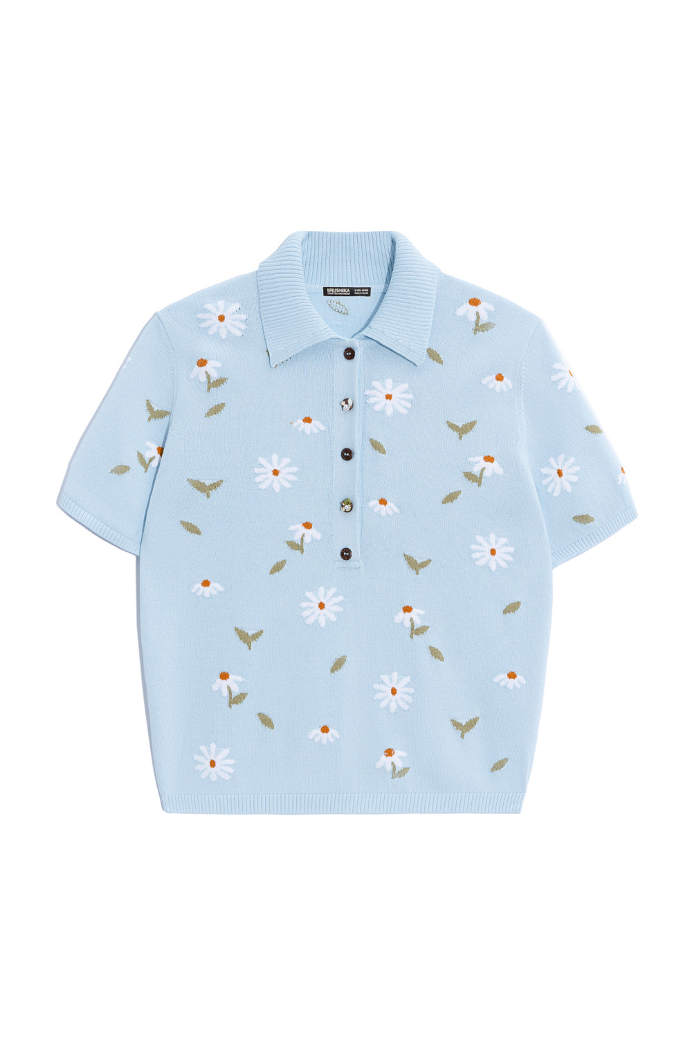 Knitted viscose T-shirt with a floral jaccarge pattern. Model with polo collar, beaded button placket and short sleeves.