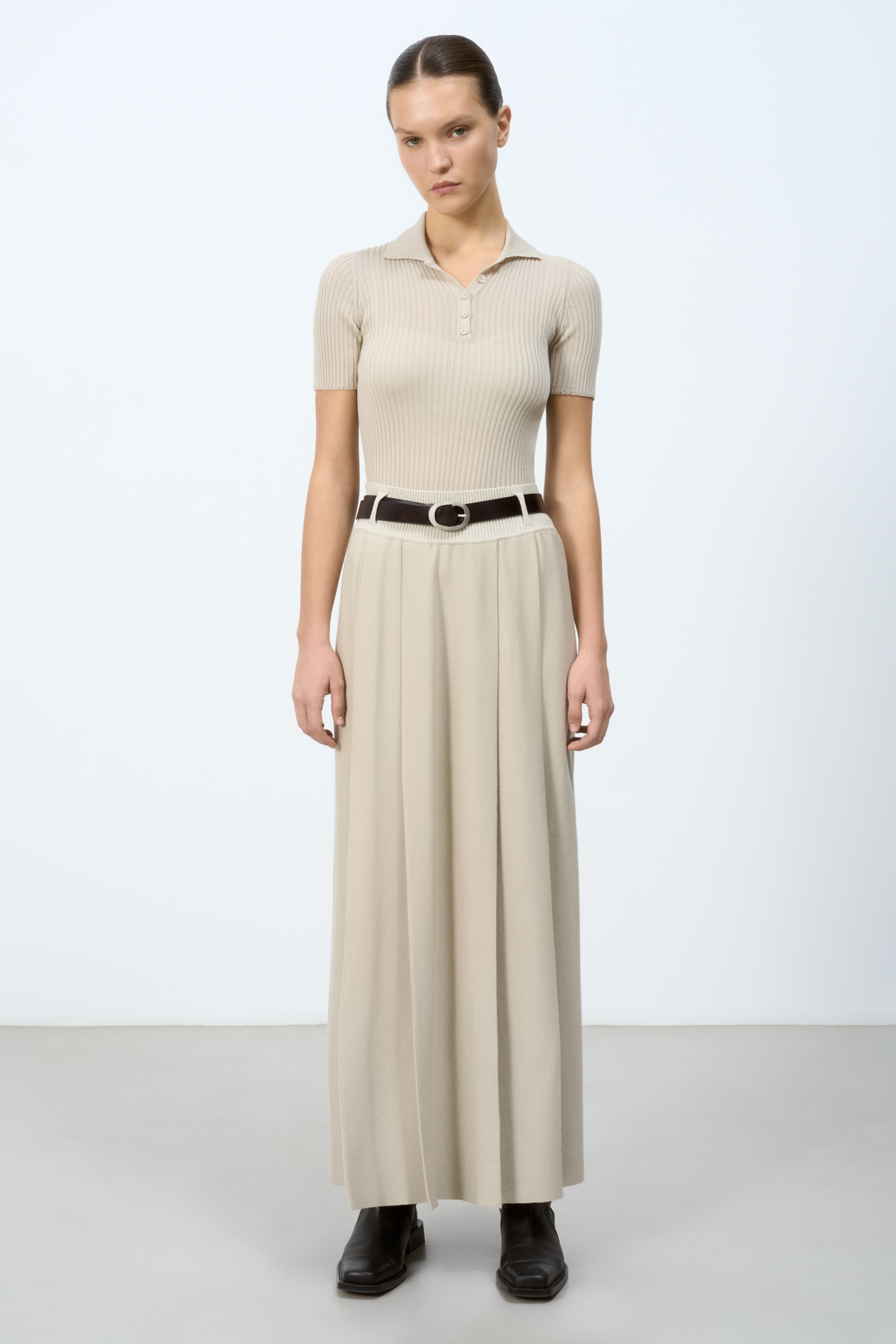 Wool blend knitted polo. The model has a fitted silhouette, short sleeves, a turn-down collar and a button closure on the placket.