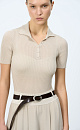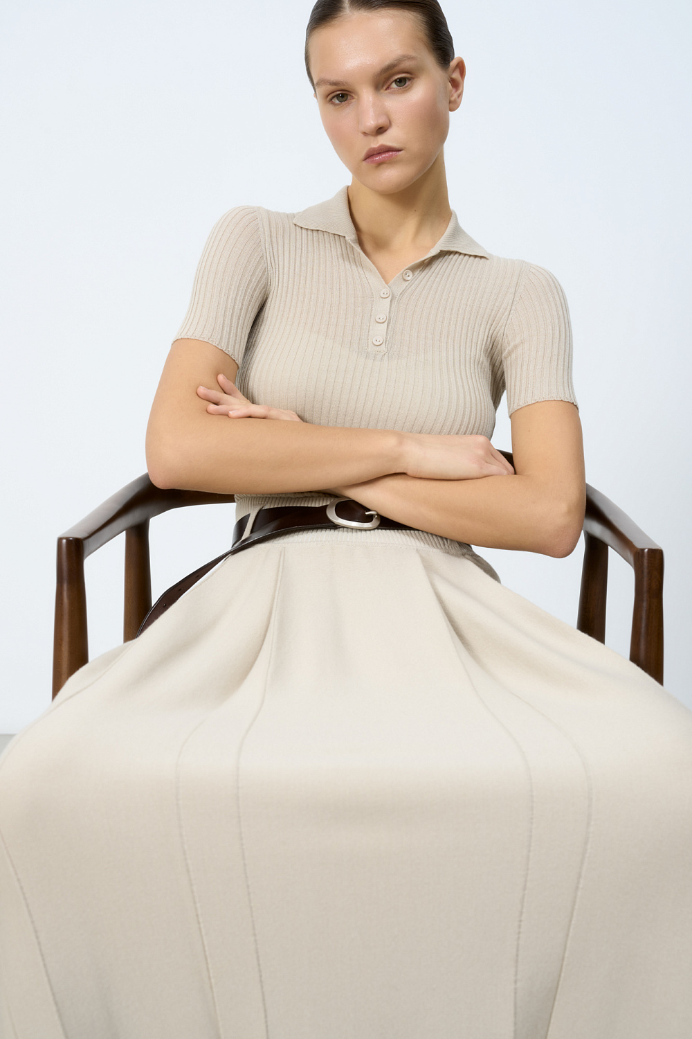 Wool blend knitted polo. The model has a fitted silhouette, short sleeves, a turn-down collar and a button closure on the placket.