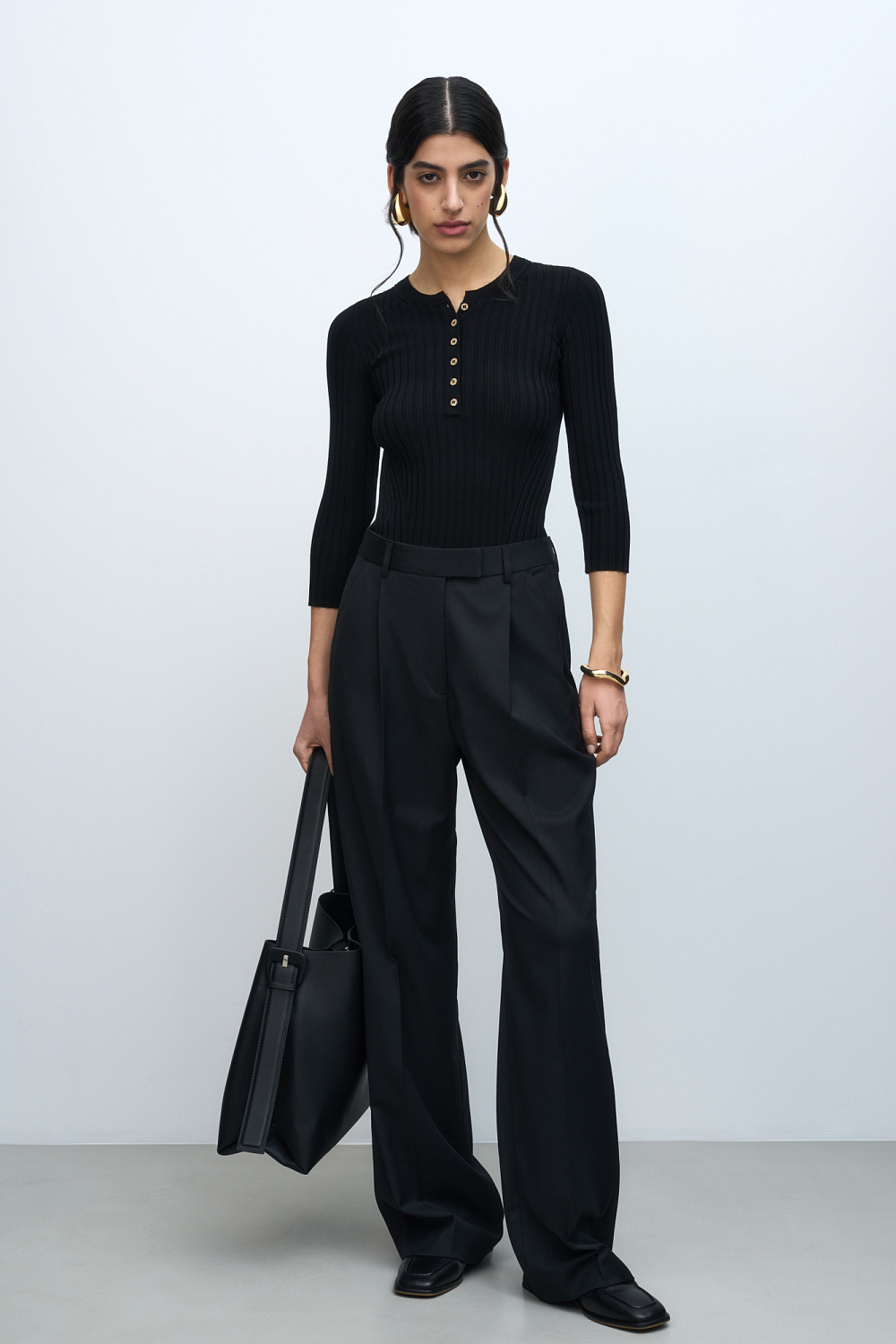 Wide rib-knit viscose jumper with 3/4 sleeves and button closure.