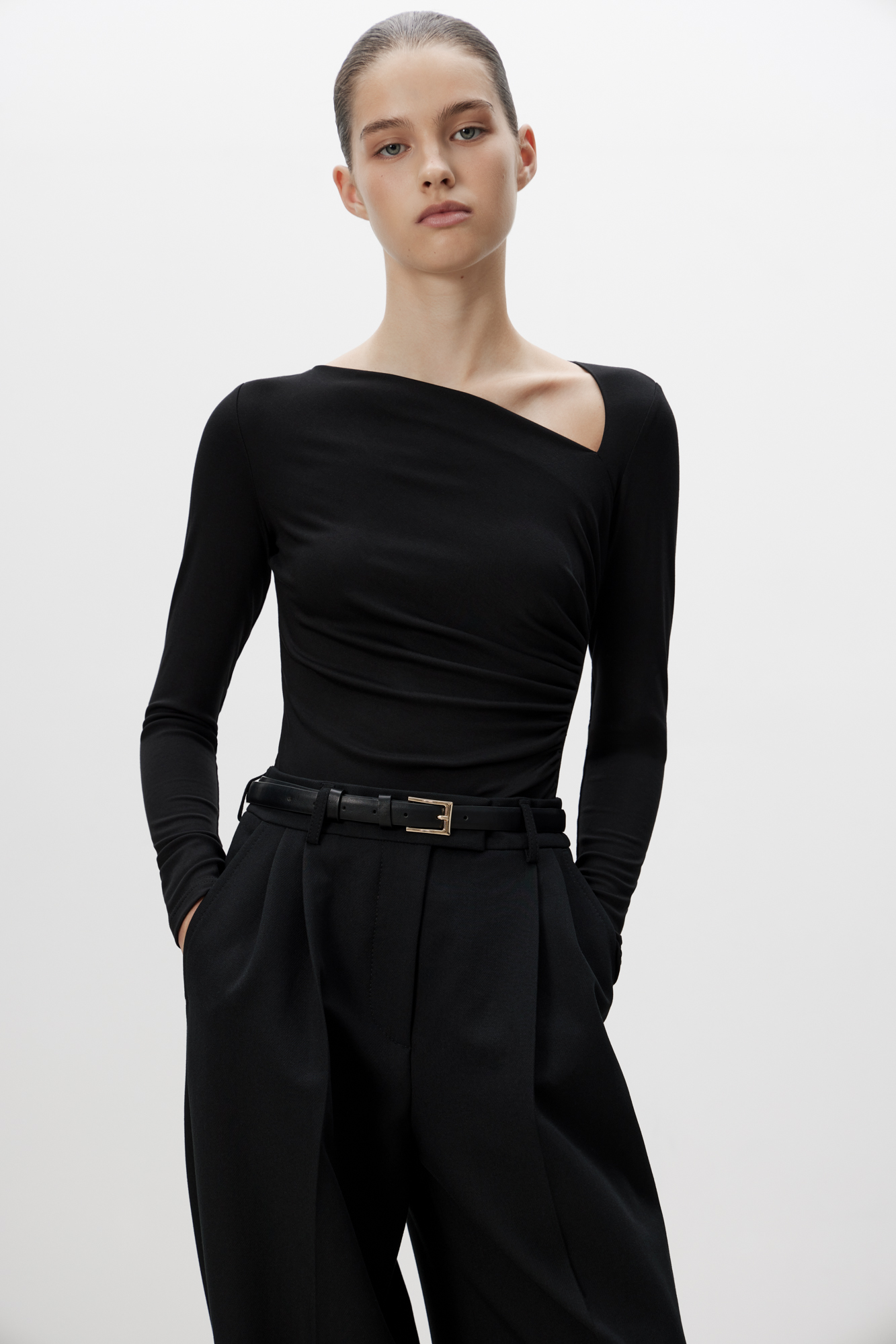 Longsleeve with an asymmetrical neckline. A fitted silhouette with draping on the side.