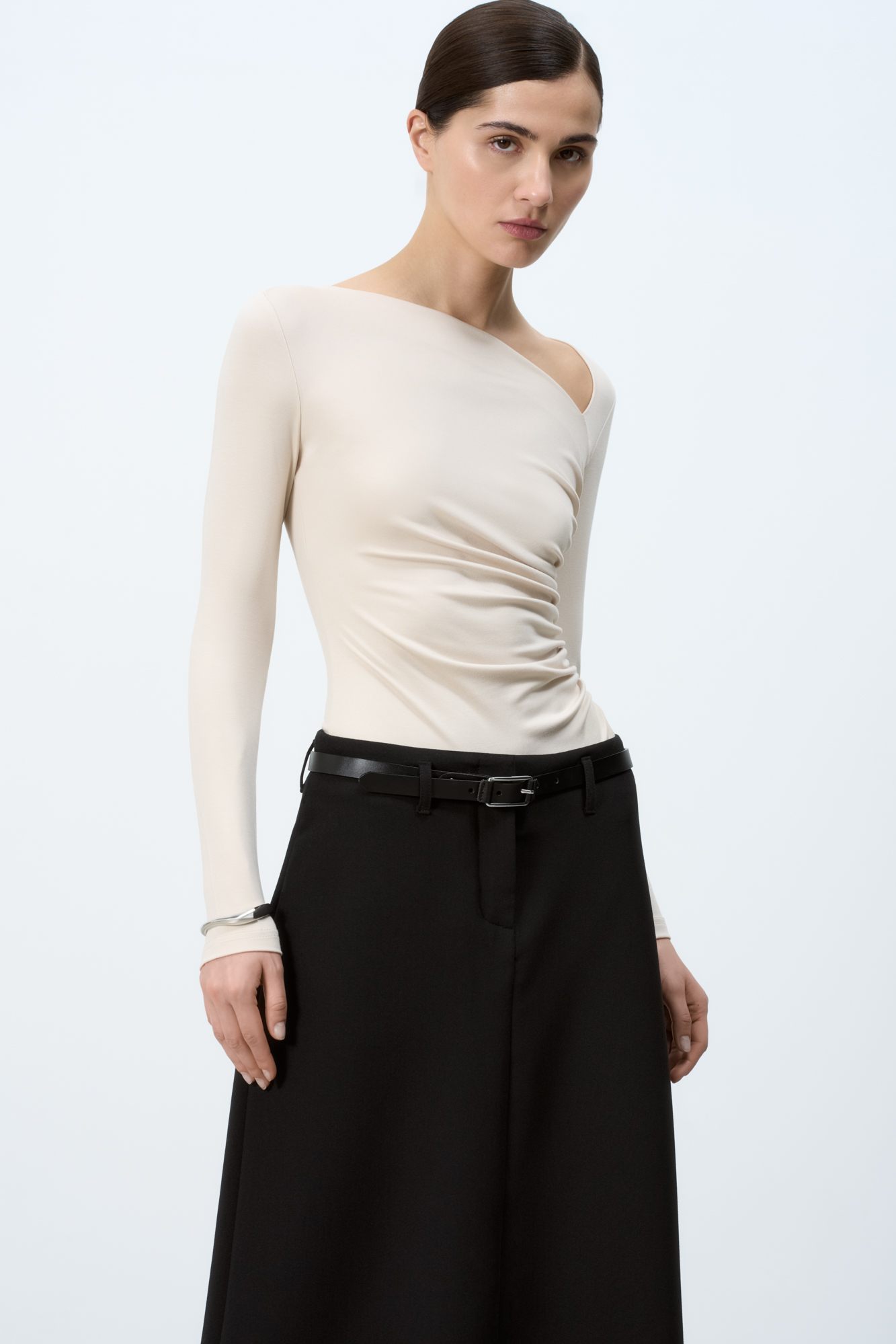 Longsleeve with an asymmetrical neckline. A fitted silhouette with draping on the side.