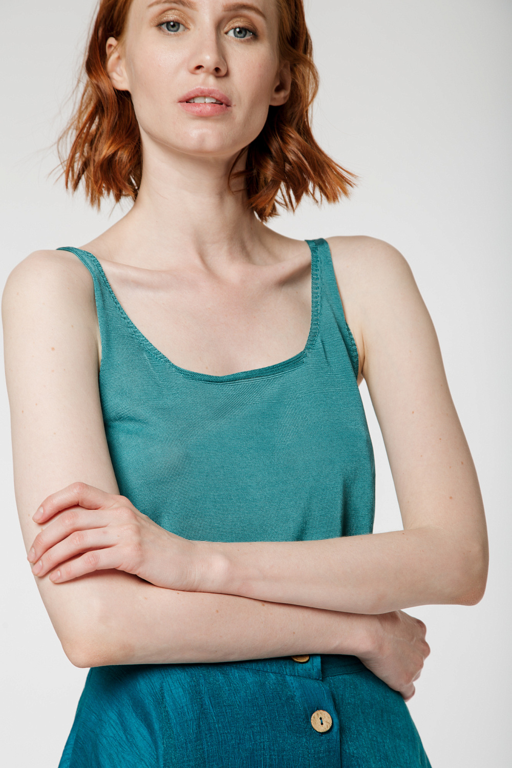 Knitted seamless 100% viscose top with thin straps.