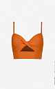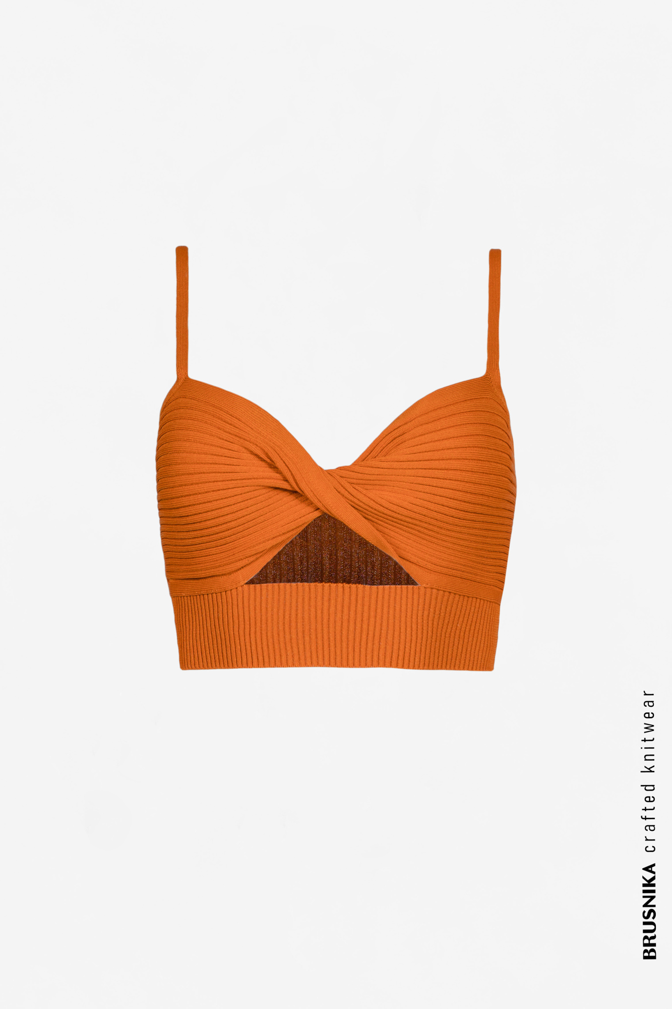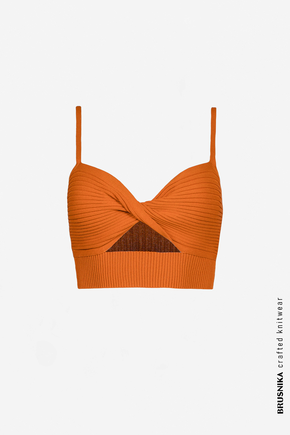 Knit top with twist front and thin straps. There is a wide elastic band at the bottom of the top for a tight fit on the body.