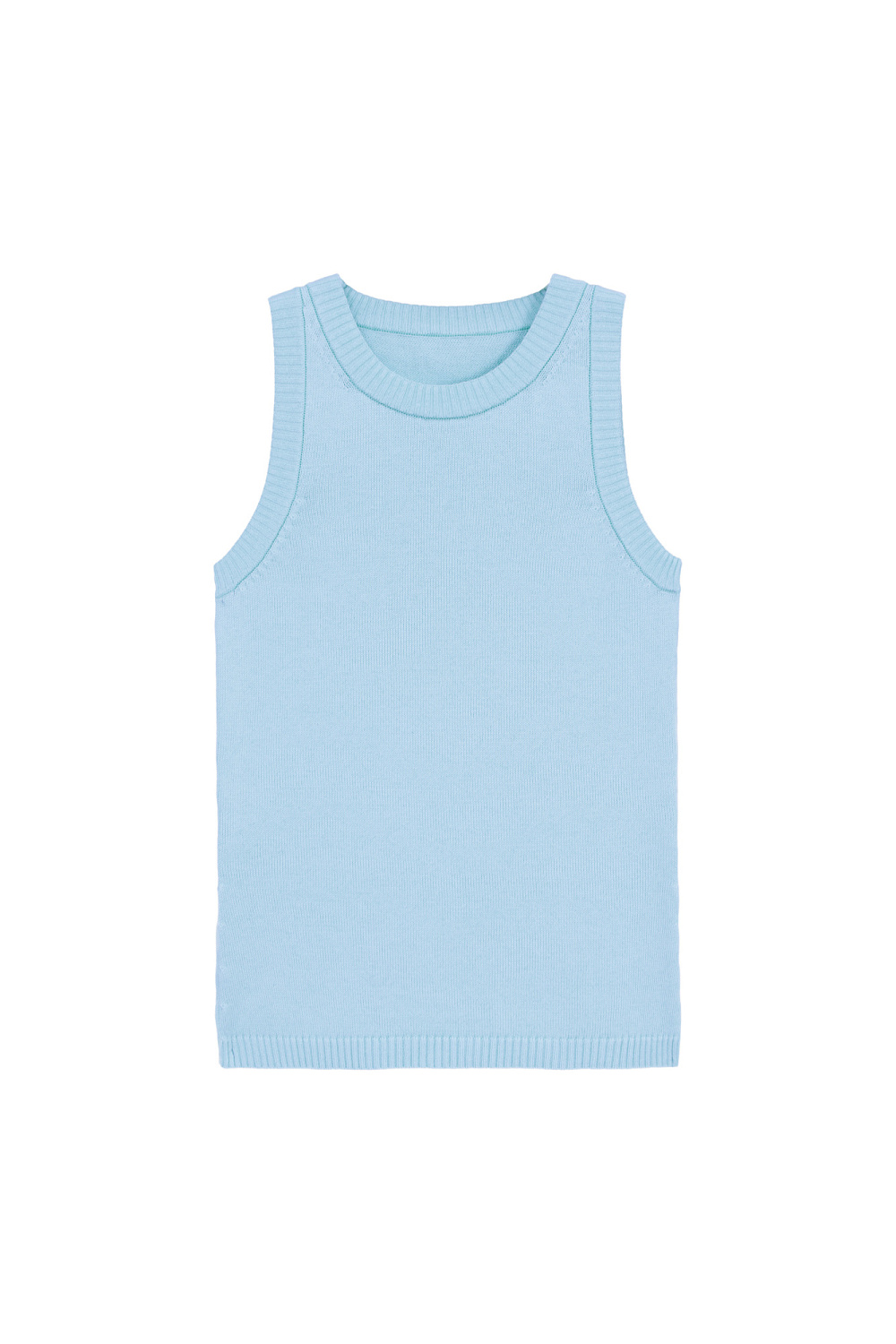 Sleeveless 100% cotton knitted top. Model of a fitted silhouette with a round neckline. The edges of the product are ribbed.