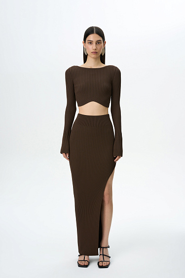 Viscose ribbed crop top. Fitted model with an open back. Pairs perfectly with a matching skirt.