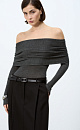 A long-sleeved woolen knit top with an open shoulder line.